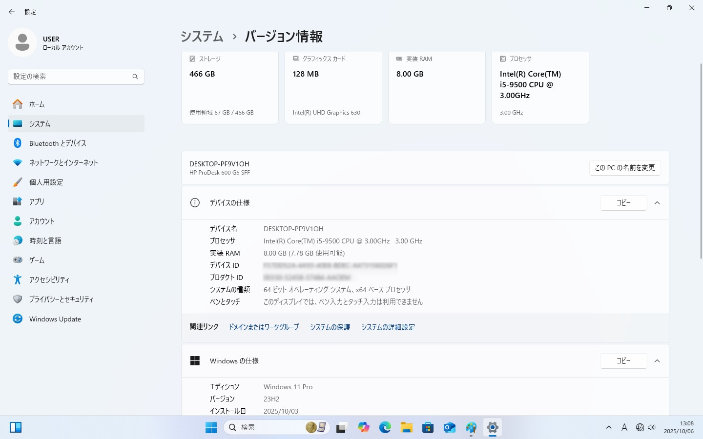 ・商品の状態 | ★HPのクラウド回復クライアントソフトを使用してリカバリをダウンロードし、Windows10 Pro 64bitでリカバリーしています。 ★Officeはありません。 ★OSのバージョンをWindows11 Pro 64bit 23H2にアップデートしています。 ★BIOSの表示確認済みです。 ★USB、LAN、USB-C、RGB、DisplayPortの動作確認済みです。 ★CD、DVDの読み込み確認済です。書き込みは未確認です。コピーしたメディアなどメディアによって読み込まない場合もあります。 ★イヤホンジャック、PC AUDIOケーブルの挿し口等、上記以外の動作は全て未確認です。 ★メモリー、HDDはチェックツールによる動作確認はしておりません。 ★分解しての内部チェックは行っておりません。 ★内部はエアーをかけて埃などは取り除いています。 ★上面後方に小さな塗装はげの傷があります。(写真7枚目) ★細かい傷や汚れなどはあります。 ★その他のデバイスについてもすべて未チェックです。 ★すべてを完全にチェックできていません、確認できている範囲での出品となります。 ★写真に写っている状態でのお渡しとなります。 簡易メンテでのお渡しです ※中古品ですので、経年なりの傷や使用感がございます。 神経質な方のご入札はご遠慮下さい。予めご了承お願いします。 | ||||||||||||||||||||||||