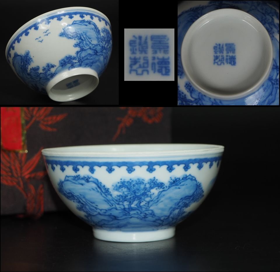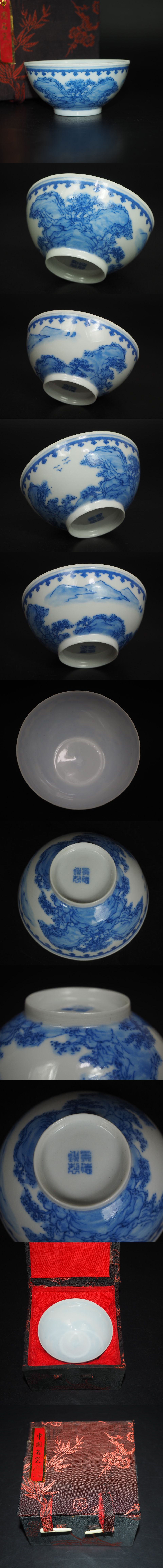 商品説明 | 高さ約 4.1cm 口径約 8.4cm ご覧のように、60~70年代景徳鎮製山水図青華薄胎碗です。手描きの青華薄胎碗は滅多にない、希少品です。状態は完品無傷です、詳しくは写真でご確認ください。木箱はあわせ箱です。 |