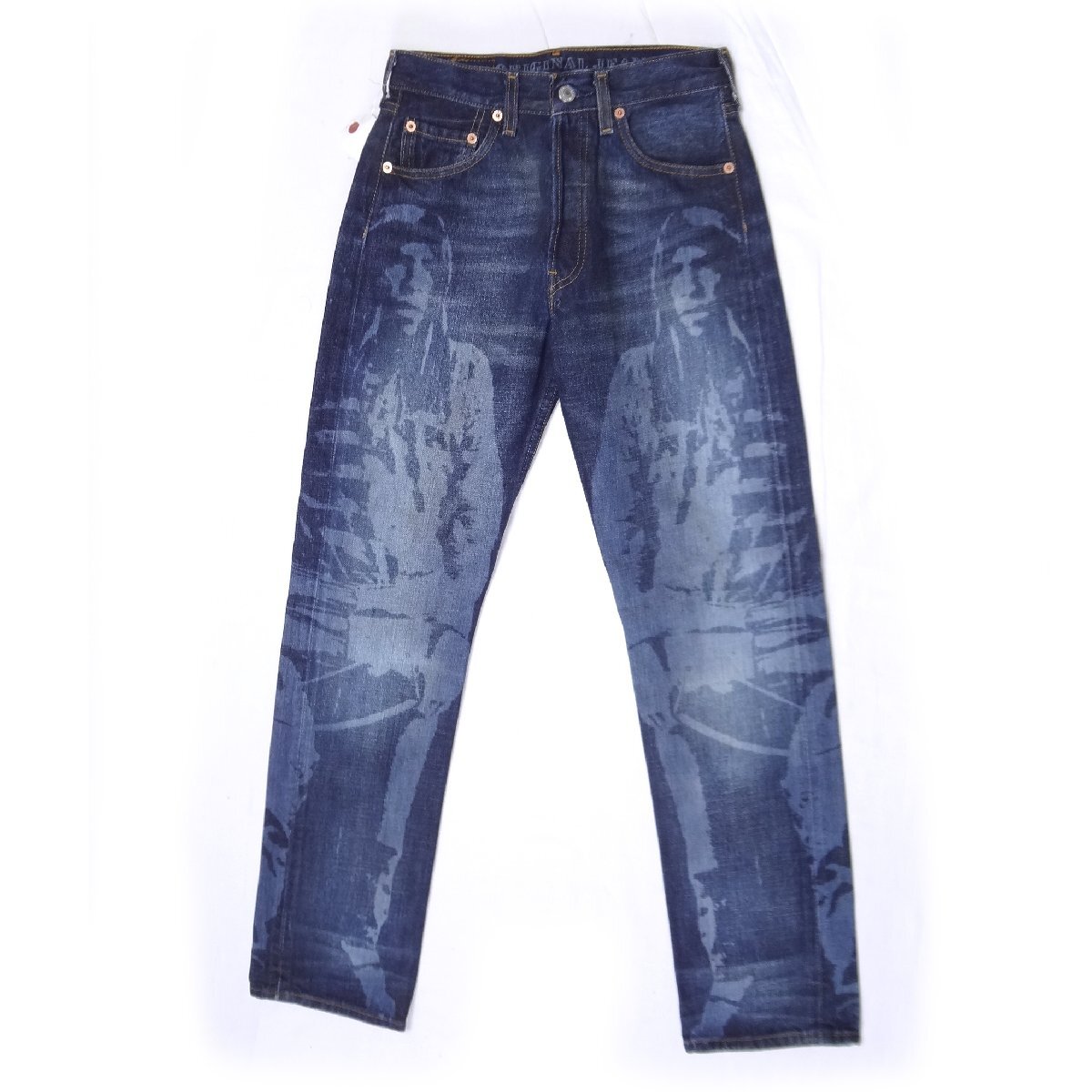 リーバイスの501ボブマーリーレザープリント、実店舗の店頭展示品を1度洗濯しただけの未使用品、Levi'sインディゴブルージーンズ、ジーパン、細くないストレート、綿100%