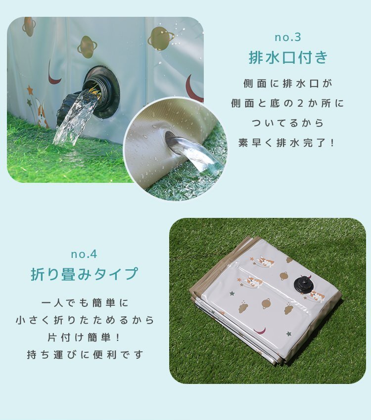 | \ 面倒な空気入れ不要♪ / 簡単設置、簡単片付けでマルチに使える折りたたみプール! 空気入れ作業不要!パタパタ開いて水を入れたらすぐに遊べます。 滑りにくく、やぶれにくい仕様となっているため、お子様も安心してお使いいただけます。 排水口が2か所ついており素早く排水できます! 一人でも簡単に畳めて、片付けもラクラク♪ ワンチャンの水遊びやお風呂としての使用の他、子供用のプールや砂場、室内ではボール遊びにもオススメ! コンパクトなので収納や持ち運びにも便利です。 ※カラーボールは別売りです ■商品コード:GAC006DG ■商品仕様 カラー:コーギーブラウン サイズ:(約)160cm×160cm×30cm 重量:(約)4.7kg 素材:ポリ塩化ビニール(PVC) ■注意事項 ・使い始めは、素材特有の匂いがする場合があります。一日程度、風通しの良い場所に広げておくと解消されます。 ・製造過程の為、多少の折り目、製造時の汚れ、シミ、シワ、色落ち、若干の接着剤残りなどある場合がございます。 不良ではありません。これらを理由とする不良返品、不良交換はお受け致しかねます。予めご了承下さい。 ・必ず保護者同伴のもと、本商品をご利用下さい。 ・本品は水深が深くなるため、対象年齢未満のお子様は使用しないで下さい。 ・プールを置く付近に破損の原因となるトゲやガラス片、金属片、木片、砂利などがないか、ご確認下さい。 ・タバコや火気には近づけないで下さい。 ・プールは安定した平らな場所でご使用下さい。 傾斜のある場所、タイル・煉瓦など目地や段差のある場所でのご使用は変形・破損の原因になりますので避けて下さい。 ・表面に塗装、コーティング等の処理された場所でのご使用は塗装等が変色したりプール本体に色移りすることがあります。ご注意下さい。 ・商品は、モニターによって色合いが異なって見える場合があります。 ・仕様・デザインは改良のため予告なく変更することがあります。 ■保障期間 7日間 ※商品到着後7日以内の初期不良・破損のみご対応させていただきます。 【新品未使用品です】 |