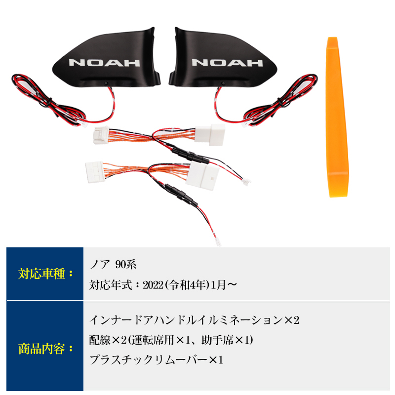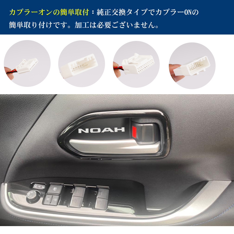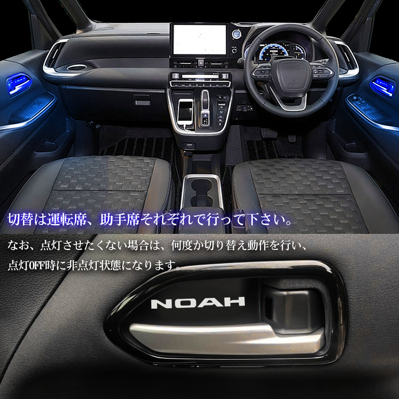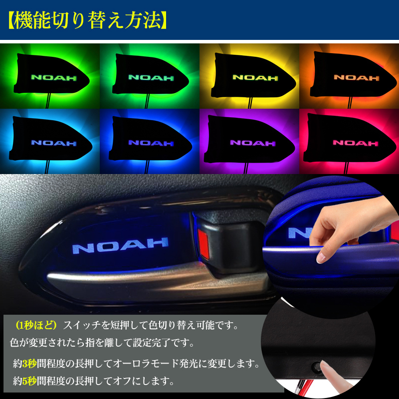 | 商品説明 | トヨタ ノア 90系用インサイドドアハンドルライトです! カプラーオンの簡単取付:純正交換タイプでカプラーONの簡単取り付けです。加工は必要ございません。 車内側ドアハンドルインナーをLEDイルミネーションで優しく照らします。 【8色切替え可能】 【機能切り替え方法】 切替は運転席、助手席それぞれで行って下さい。 ・12V専用