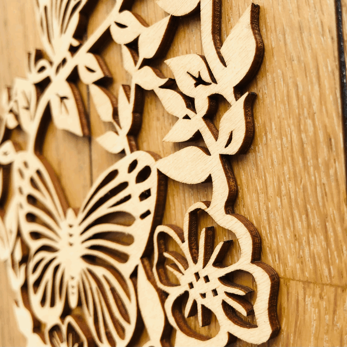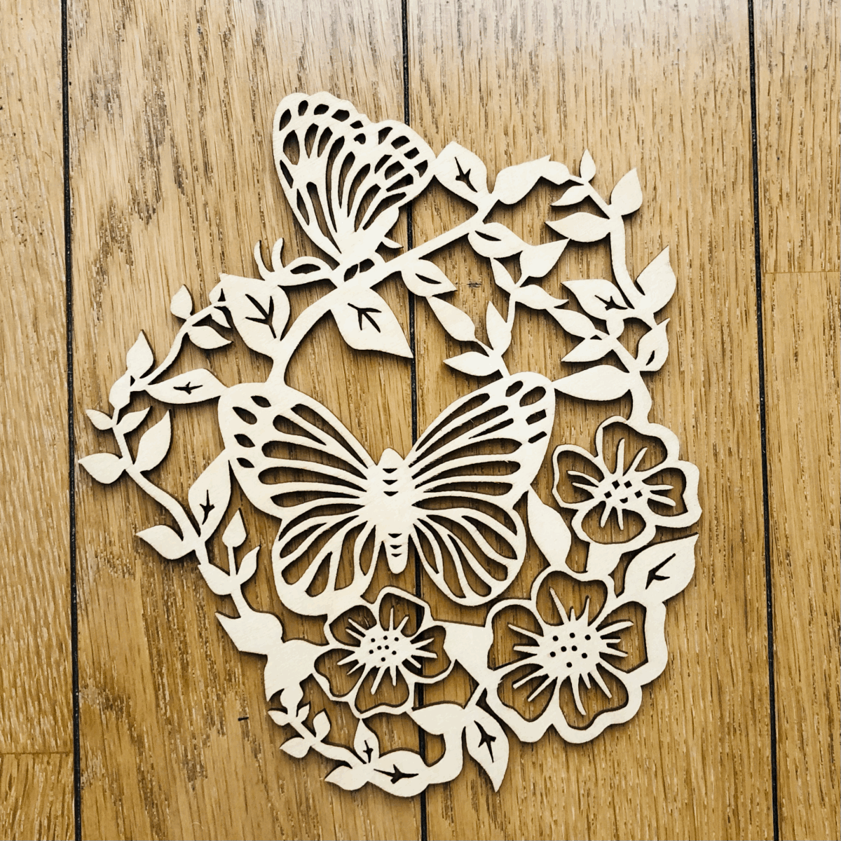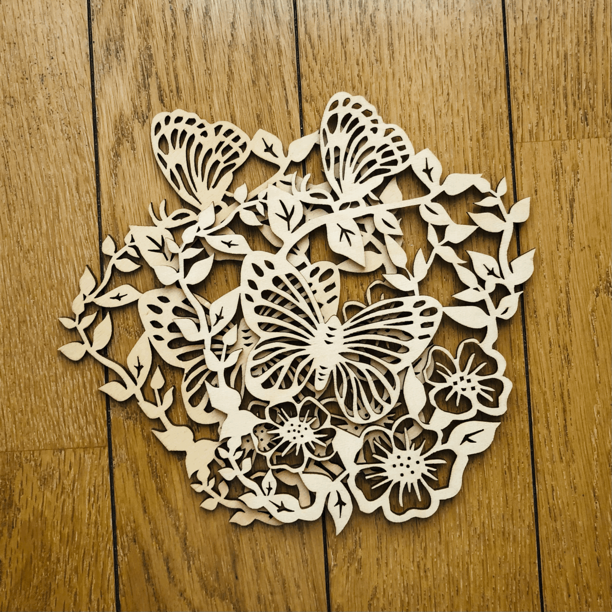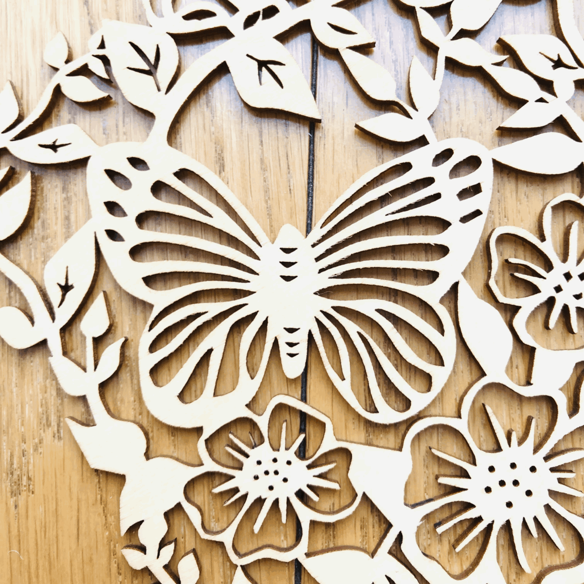 【リトアニア共和国】【2枚セットのコースター】 蝶と花の美しいカットアウトデザインの木製コースター。 レーザーで繊細な透かし彫りをした薄い木の板でできています。 金属やプラスチックと違って、ぬくもりのあるやさしい質感が魅力です。 美しい透かし彫りを活かしてオーナメントとして飾ってもすてきです。 アイディア次第で使い方いろいろ楽しめます。 ルームライトの元で影絵を楽しむこともできます。 - 生産国:リトアニア共和国 -サイズ: 15cm X 13.5cm、厚さ3mm - デザイン: 蝶と花のカットアウトデザイン - 素材: 木製(白樺合板) - 特徴: 細かいカットが施された装飾的なコースター
