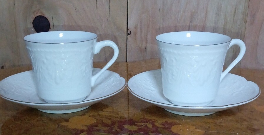 エンボス加工のホワイトカップとソーサー、金縁付き。| 出价者 | 信用 | 价格 | 时间 |