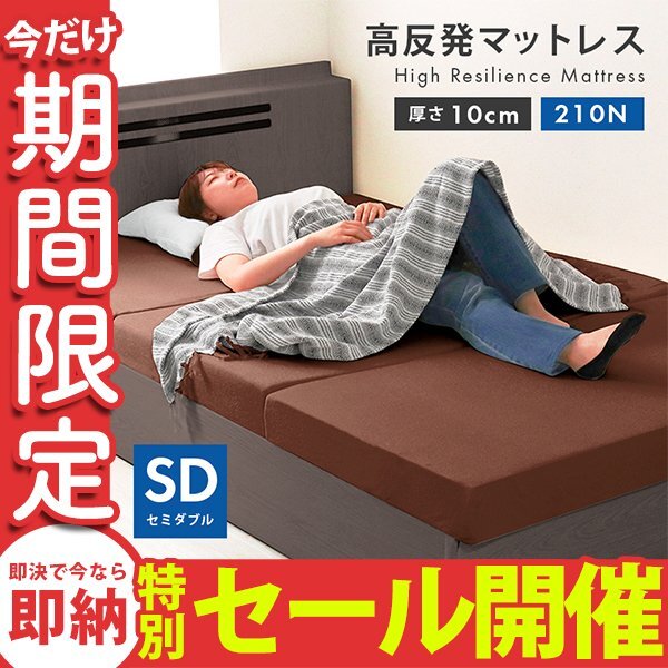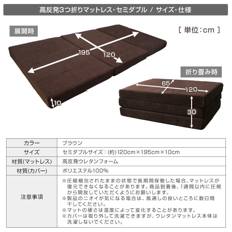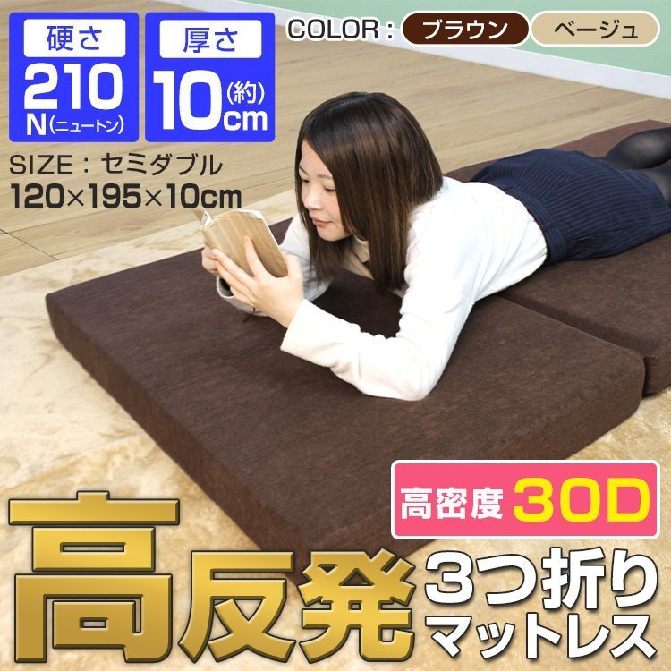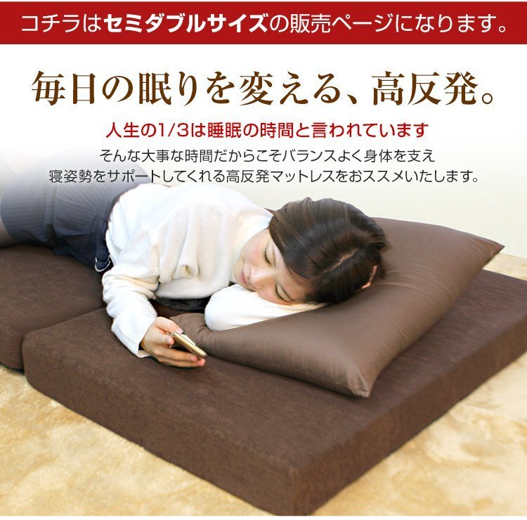 | 厚みたっぷり10cm! 適度な硬さで身体をしっかり支える、三つ折りタイプの高反発マットレスです。 柔らかいマットレスとは違い、身体の沈み込みを軽減した腰に優しい寝心地です。 高反発マットレスのウレタンフォームは弾性が高く、適度な硬さで身体を支えるので、底つき感もなくへたりにくいマットレスです。 寝返りが多い方や仰向けに寝ることが多い方におススメです。 簡単にたためる三つ折りタイプなので、お部屋で立て置きして日当たりのいい場所で部屋干しが可能! 取り外しやすいL字ファスナー付き洗えるカバーが付属しています! 【商品仕様】 カラー:ブラウン サイズ(約):幅120cm×長さ195cm×厚み10cm(セミダブルサイズ) 折り畳み時(約):幅97cm×長さ65cm×厚み30cm 素材:高反発ウレタン 、パイル生地 他 硬さ:210ニュートン ※耐熱仕様ではございませんので、電気毛布との併用はおやめください。 (マットレス シングル セミダブル ダブル 高反発 低反発 高反発マットレス 低反発マットレス シングル 高反発マット 低反発マット マット ベットマット ベッド 敷き布団 洗える カバー 寝具 人気 おすすめ ) |