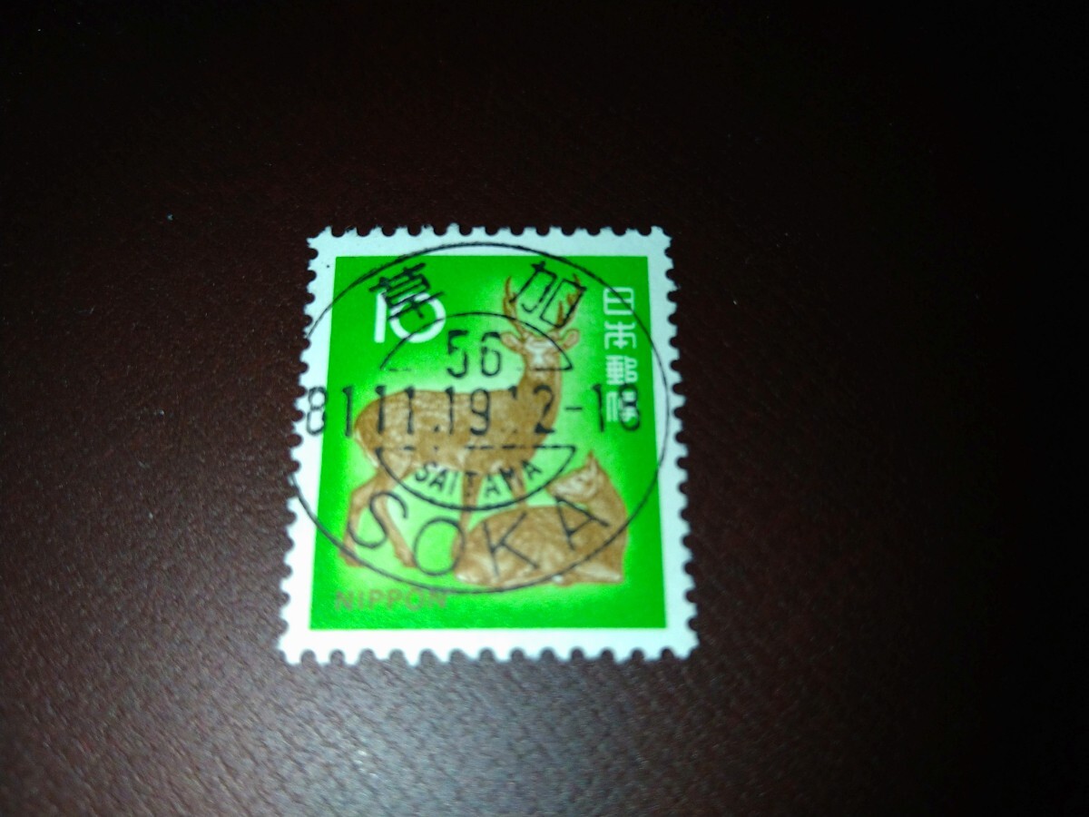 通常切手(1972年シリーズ)10円鹿に草加局の旧和欧文機械印。はっきりした満月印で切手の状態も概ね良好ですが、裏面にやや糊残りがあります。