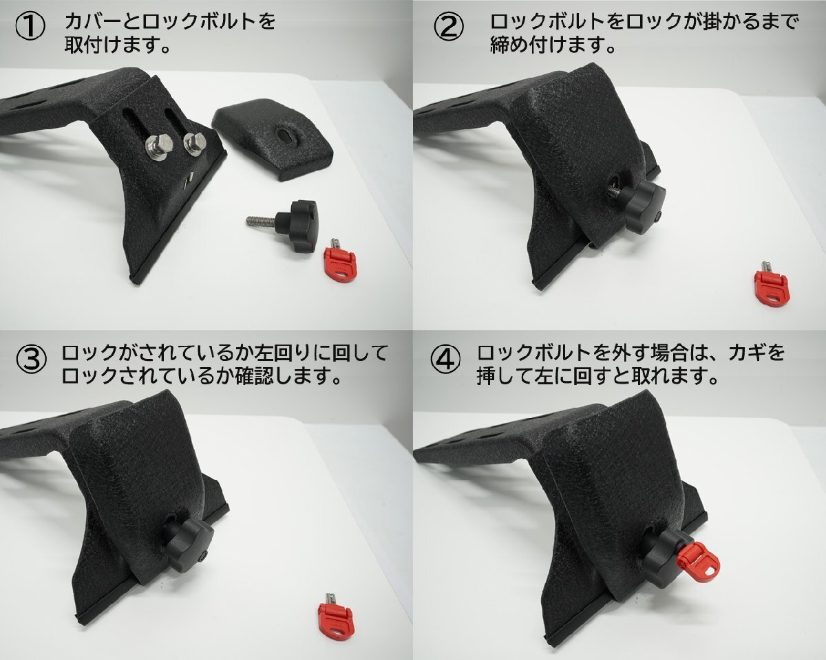 | 特 徴 | ルーフラックの足のカバーを止めるボルトを、ロックボルトに変えて 専用ロックシステムを時計回りに回しこむだけです。 |