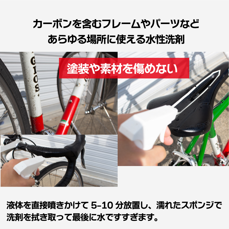カーボンを含むフレームやパーツなどあらゆる場所に使える自転車用水性洗剤。 泥やほこりなどの表面の汚れを落とし綺麗に。 液体を直接噴きかけて5-10分放置し、濡れたスポンジで洗剤を拭き取って最後に水ですすぎます。 無臭タイプなので、香りが苦手でも安心に使用できます。 狭い空間でも気にせず使えます。 酸や危険な化学物質を含んでいません、欧州REACH規制の認可対象です。 ロードバイクやクロスバイク、mtb、電動自転車、ままちゃりまで日々のメンテナンスに。 環境に優しい生分解性を持ち、100%自転車専用水性洗浄剤。 商品内容GX-WASH バイクウォッシュ 容量300ml 成分LAS生分解性界面活性剤、EG、coconut extract 発泡剤等 機能あらゆる自転車の表面や部品の洗浄 毒劇区分普通物 容器仕様プラスチックスプレーボトル サイズ高さ約19cm (スプレー5.5cm含み), ボトル直径約φ7cm ON/OFFオンオフ切替式、ロック機能付 台湾製 《ご注意》 ・商品は入荷によりキズがある場合があります。 その場合は保証対象外になりますのでご了承お願い致します。 ・ディスプレイ環境により実物と色が異なる場合が有ります。 ・入荷時期により予告無く一部仕様変更する場合が有ります。 | |