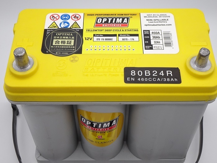 | オプティマバッテリー イエロートップ / OPTIMA BATTERIES YT-80B24R1 (別名YT-80B24RT1 , YT-S2.7J) Rタイプ B端子(小ポール) ●イエロートップはディープサイクルバッテリーで非常にタフネスです!レッドトップの上位モデルとして高いCCAも持ち合わせカーオーディオやサブバッテリー、補助電源、工業機械、電飾パレード、EVカー等に最適です。 最大出力 5520W(-18度/10秒間/EN規定) 適合バッテリー N-55R、S46B24R、EHL-S46B24R、46B24R、50B24R、55B24R、60B24R、65B24R、80B24R、EL-70B24R、ECT 60B24R 等 アイドリングストップ車、ハイブリット車・充電制御車・エコカー対応 正規品 3年製品保証 走行無制限 プリウス適合 プリウスW20、W30、α、PHV 純正品番 S34B20R、S46B24R ※ 純正バッテリーにはガス抜きホースが付いています。オプティマはドライバッテリーのためガス抜き不要ですが、 ガス抜きホースはダミーの穴を短側面上部に作ってあるので差し込んでおいて下さい。 ※ 加工不要で搭載可能です。 プリウス(α、PHV含む)、アクア等のハイブリッド車、リーフEV車には駆動・走行用のメインバッテリーのほかに 12Vの補機用バッテリーが装着されています。 メインバッテリーは走行やエアコン、補機用バッテリーの充電に電気を使っております。 補機用バッテリーは車両のコンピュータに電気を送り、ハイブリッドシステムを起動する際の電源となります。 補機用バッテリーは、ライトやナビ、カーオーディオ等室内の12V電装品に使われます。 補機用バッテリーが劣化するとメインバッテリーからの充電が増えエンジン稼働時間が増え燃費も悪化します。 また、カーオーディオの音質に直接影響する補機用バッテリーはCCAの高いハイパワー型のバッテリーが望まれます。 Rタイプ B端子(小ポール) リニューアル版です 電圧 12V 20時間率容量 38Ah(EN-N) コールドクランクアンペア 460CCA クランクアンペア 575CA 内部抵抗 4.3mΩ リザーブキャパシティー 60分 サイクル寿命 350サイクル エンジン始動可能回数 12000回以上 幅 奥行 総高さ/箱高さ 237W x 129D x 227/202H 重量 12.5Kg BCI Group : 51 オプティマ専用充電器も取り扱ってます。 オプション等詳細は こちらのサイトへ 適合バッテリー専用お問い合わせフォーム(SSL使用で安心です) OPTIMA本国サイト | |||||||||||||||||||||||||||||||||||||||||||