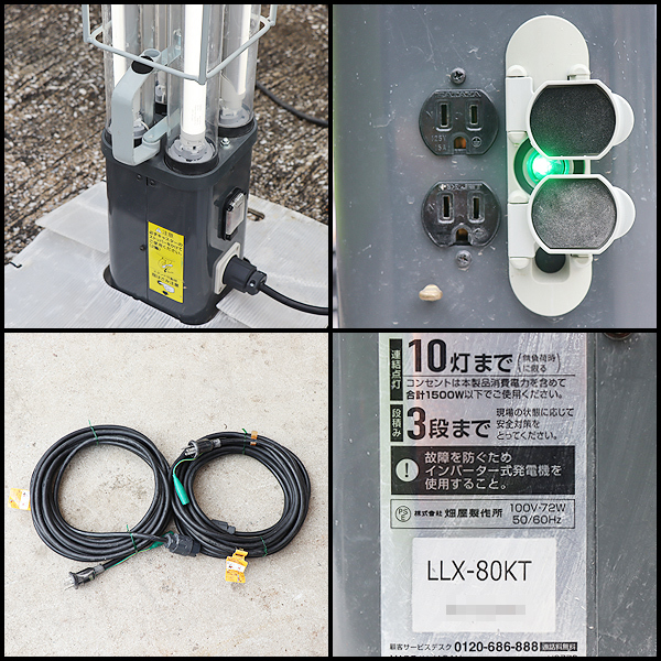 ■メーカー : HATAYA(畑屋製作所) ■型 式:LLX-80K ■作業時寸法 LDH[mm] : 450×450×1,710 ■格納時寸法 LDH[mm] : 210×450×1,710 ■乾燥重量 [kg] : 16(ケーブル除く) ■周波数 [Hz] : 50/60Hz兼用 ■定格電圧 [V] : 単相100 ■定格電力 [W] : 72 ■光源 : 18W直管形LEDランプ×4本 ■全光束 [Lm] : 7,200 ■電線仕様 : VCT 2.0×3C(接地付) 引掛けコネクター付 ■コンセント形状 : 2P(接地付)×2個 ■メーカー希望価格 : ¥220,200(税別) |
