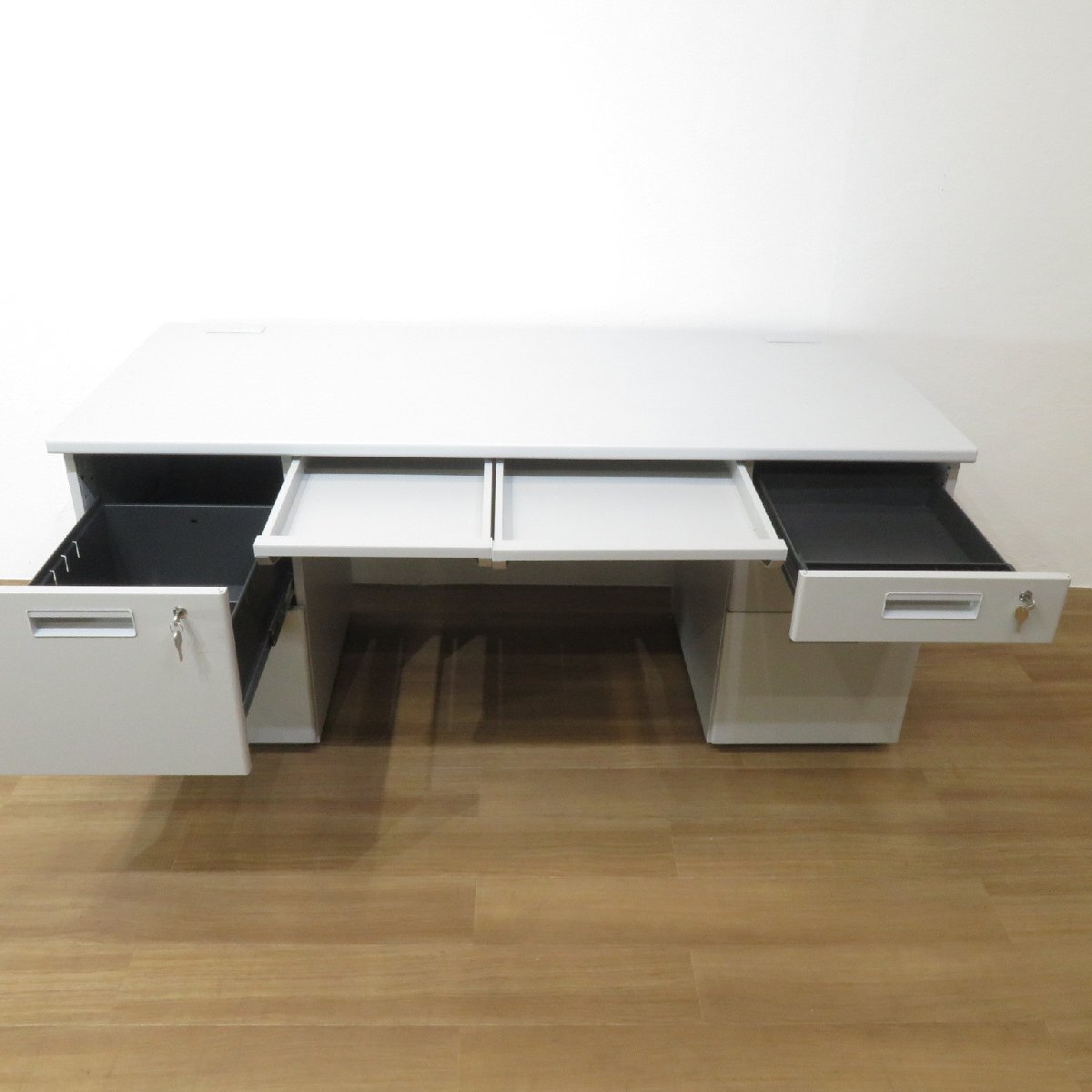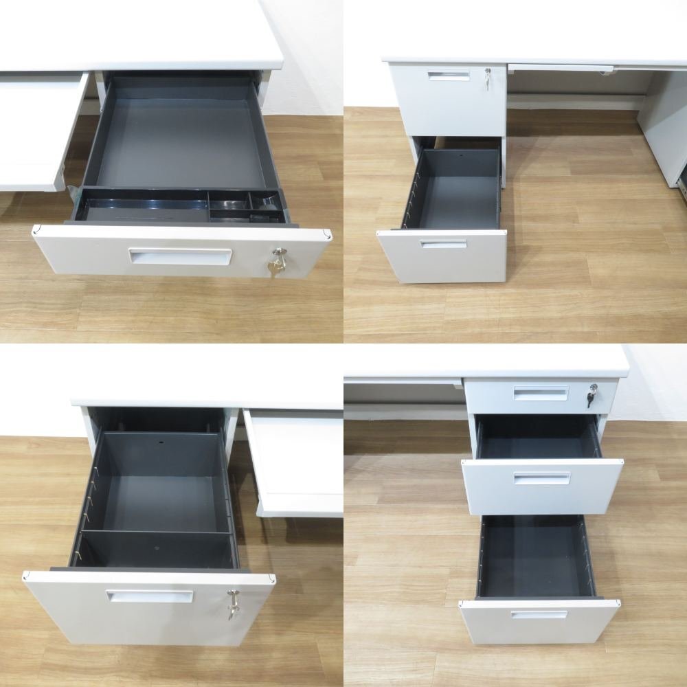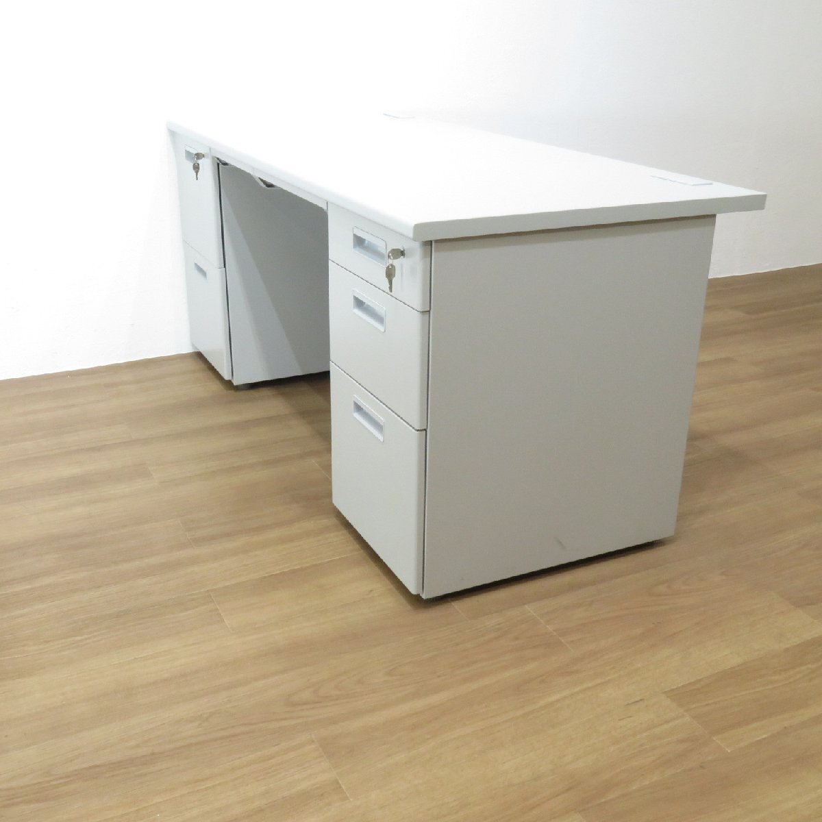 両袖デスクが入荷致しました。お色味はグレーです。 引き出しだけではなく天板下の浅型引き出しも付いている、収納豊富なオフィスデスクです。 引き出しにはA4ファイルの収納が可能。間隔を調整できる仕切り板で、書類を便利に仕分けする事ができます。 上部引き出しにはペントレーも完備。散らかりがちな細かい文具をすっきりまとめられます! 天板2カ所には配線口があるので、コード類の煩わしさがなく机上をすっきりとお使い頂けます。 シンプルスタイルでどんなオフィスにも馴染むデスク。収納スペースの拡充にぜひいかがでしょうか! |