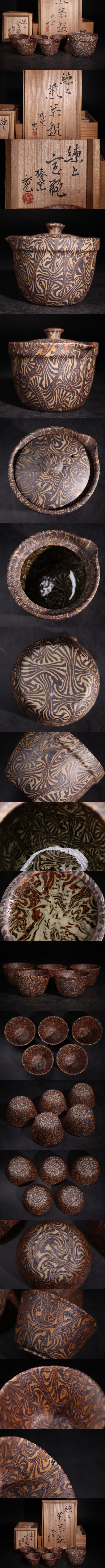 | 椿窯 荒尾寛 練上 宝瓶 ・ 煎茶碗 五客 共箱付 / 泡瓶 急須 茶器 煎茶道具 煎茶飾 .G3031 |