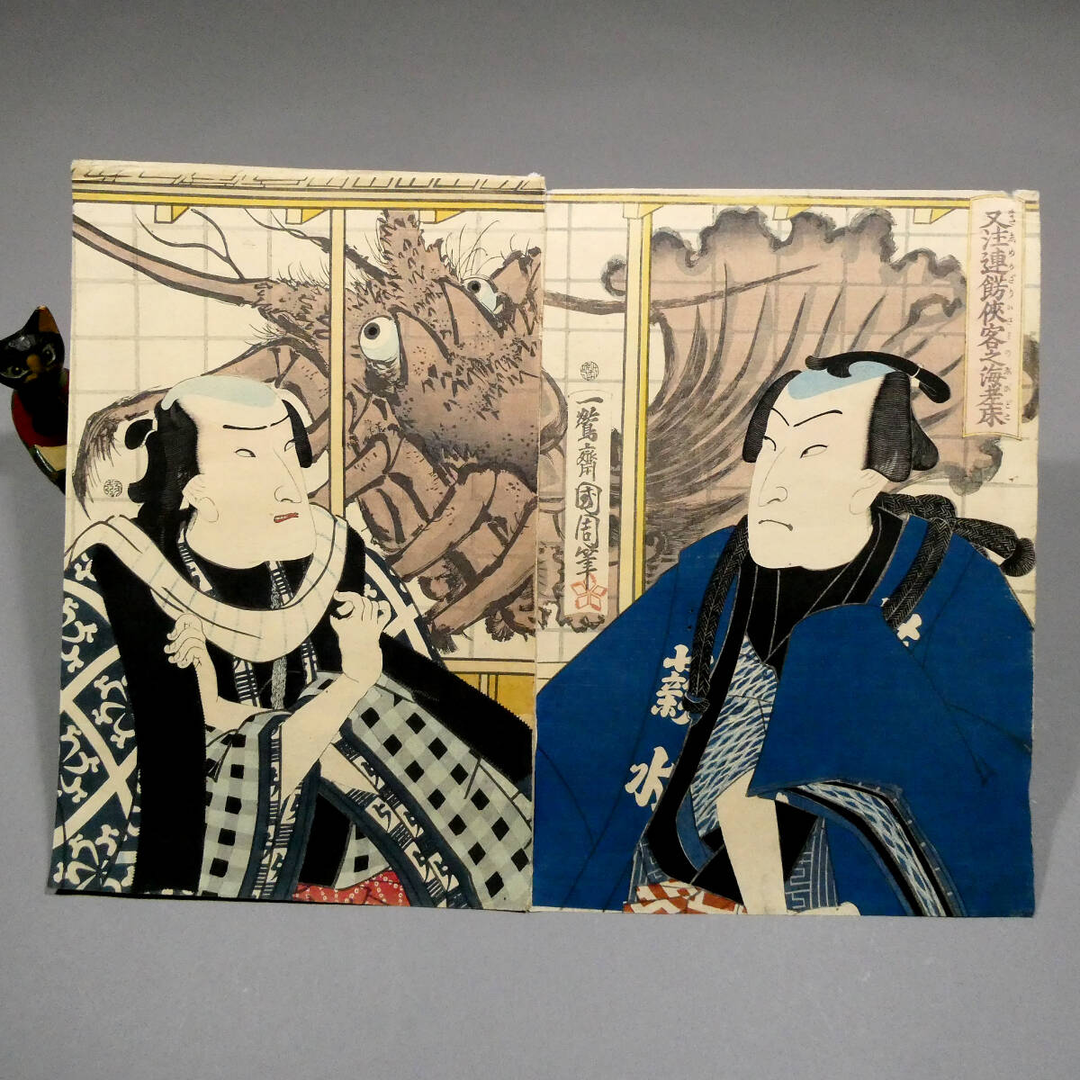 ■ 豊原国周 江戸時代 木版浮世絵 「又注連飾侠客之海老床」2枚 海老の大図 髪結い 床屋の一幕 ■