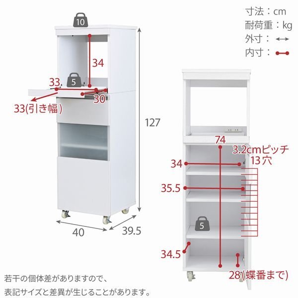 【カラー】 ホワイト、ホワイト×ダークブラウン 【サイズ】 <外寸> 幅40×奥行39.5×高さ127cm <内寸> スライド部:幅33×奥行30×高さ34cm スライド引き幅:33cm 扉内:幅34×奥行28×高さ74cm 【材質】 天板・前板・スライド棚:合成樹脂化粧合板(PVC) 本体:プリント紙化粧合板 ガラス:強化ガラス(5mm厚) 【耐荷重】 天板:(約)10kg以下 スライド棚:(約)5kg以下 可動棚:各(約)5kg以下 【生産国】 中国 【梱包】 サイズ:84×43×18.5cm、重量:22.6kg 【その他】 ・背面化粧有り ・可動棚:3枚 ・合計1500Wの2口コンセント付き(コード長さ196cm) ・キャスター4個(うち2個ストッパー付き) 【組み立て品】 お客様による組み立てが必要です。 【ご注意】 ・サイズ、重量は概算です。 ・商品カラーはご使用のモニターによって実際の明るさや色と異なって見える場合がございます。 |