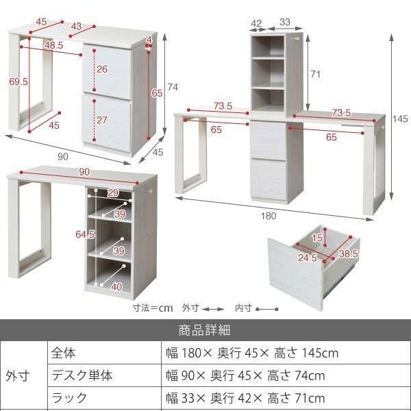 【カラー】 ナチュラル、ホワイト 【サイズ】 <外寸> 全体:幅180×奥行45×高さ145cm デスク単体:幅90×奥行45×高さ74cm ラック:幅33×奥行42×高さ71cm <内寸> ラックオープン部:幅29×奥行40×高さ64.5cm 引き出し上段:幅24.5×奥行38.5×高さ15(有効26)cm 引き出し下段:幅24.5×奥行38.5×高さ15(有効27)cm デスク面:幅73.5×奥行45×高さ74cm デスク下空間:幅65×奥行45×高さ69.5cm フック:出幅4×高さ65cm 可動棚:幅29×奥行39×厚み1.8cm(3.2cmピッチ11穴) 【材質】 本体:プリント紙化粧合板 天板:合成樹脂化粧合板(PVC) 引き出し前板:合成樹脂化粧パーティクルボード(PVC) 【耐荷重】 デスク面:30kg以下 可動棚:8kg以下 引き出し:7kg以下 【生産国】 中国 【梱包】2梱包でお届けします。 2-1 サイズ:96×49×13cm、重量:19.3kg 2-2 サイズ:95.5×47×15cm、重量:24.9kg 【その他】 ・可動棚:2枚 ・フック:4個 ・背面化粧有り 【組み立て品】 お客様による組み立てが必要です。 【ご注意】 ・サイズ、重量は概算です。 ・商品カラーはご使用のモニターによって実際の明るさや色と異なって見える場合がございます。 |