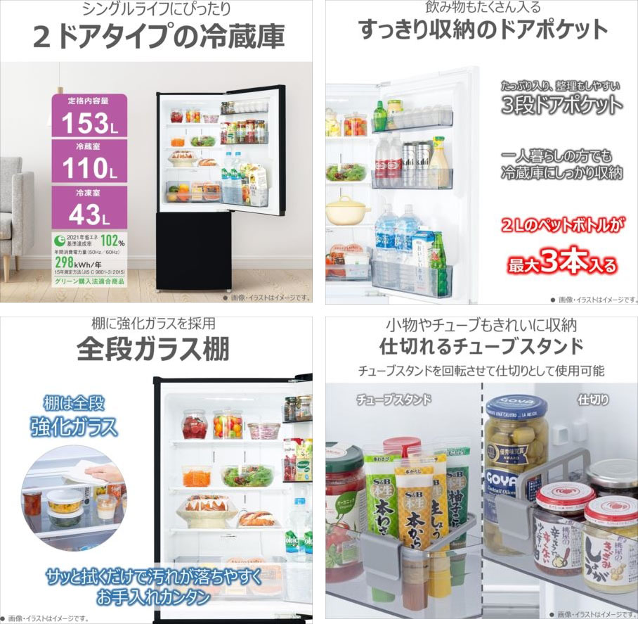 【商品特長】 ◆すっきり収納 1人暮らしにうれしい収納量です。2Lのペットボトルが3本も入るほか、冷蔵室のガラス棚も3段タイプ。 コンパクトなのに、使いやすい工夫でいっぱいです。 ◆耐熱(100℃)テーブルボード お部屋の省スペースに。オーブンレンジも使用できます。 (設置できるレンジの脚間寸法は幅400mm、奥行350mm以内) ◆スライドケース付き冷凍室 整理がしやすく使いやすい。冷凍室内に、小物類を置けるスライドケースを搭載。 下段のケースと合わせることで、作り置きの食品や大物の冷凍食品など整理整頓して収納できます。 ◆スタイリッシュなデザイン シンプルなデザインでどんなキッチンにもフィット。扉は大きなラウンドフォルムで、スタイリッシュな印象に。 また、セミマットなカラーを採用し、落ち着いた雰囲気を演出します。 | |||||||||||||||||||||||||