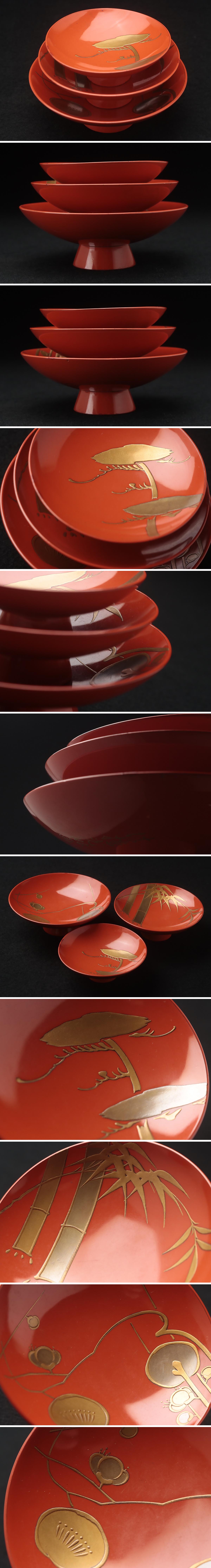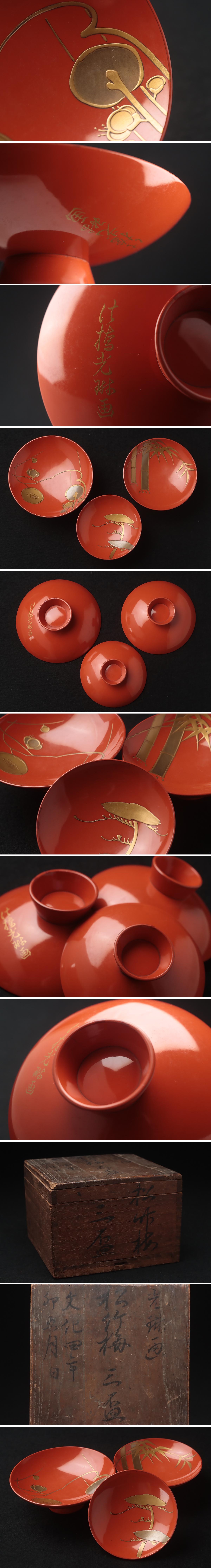 | ◆ 江戸期 時代漆器【時代【尾形光琳(法橋光琳)】朱漆塗 松竹梅蒔絵三つ組盃 時代箱付・蒔絵三ツ組杯 漆工芸 古美術 ◆
