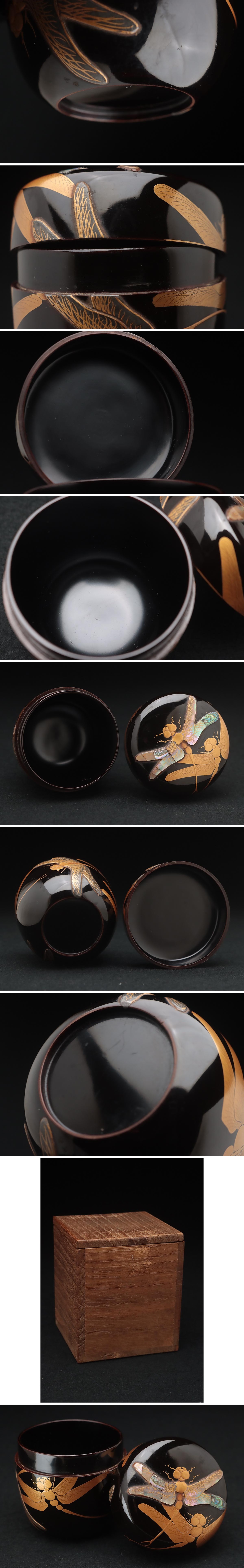 | ◆ 時代漆器 蜻蛉螺鈿蒔絵棗 高6.9cm 木箱附・群蜻蛉螺鈿高蒔絵棗 茶道具 茶器 漆工芸 古美術 ◆
