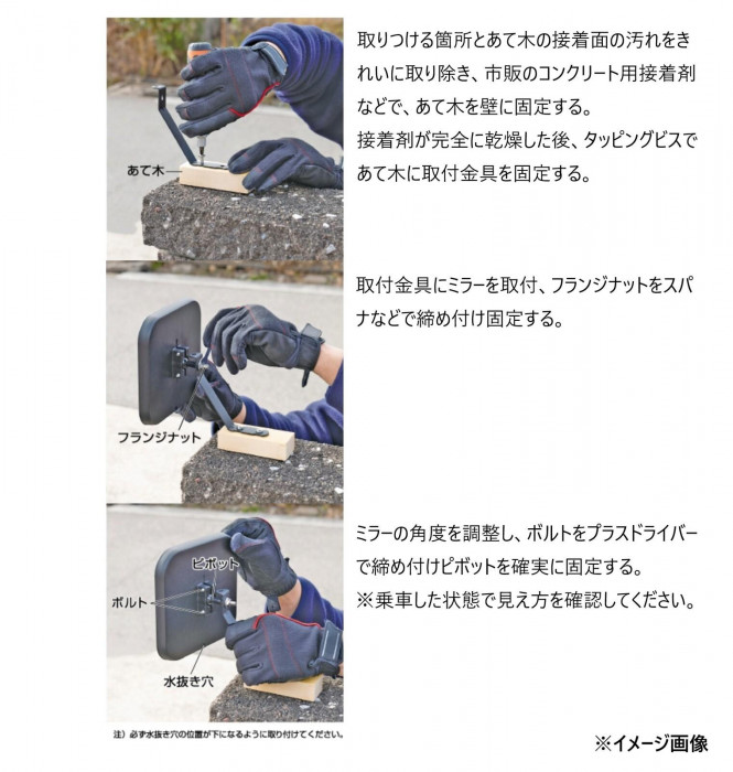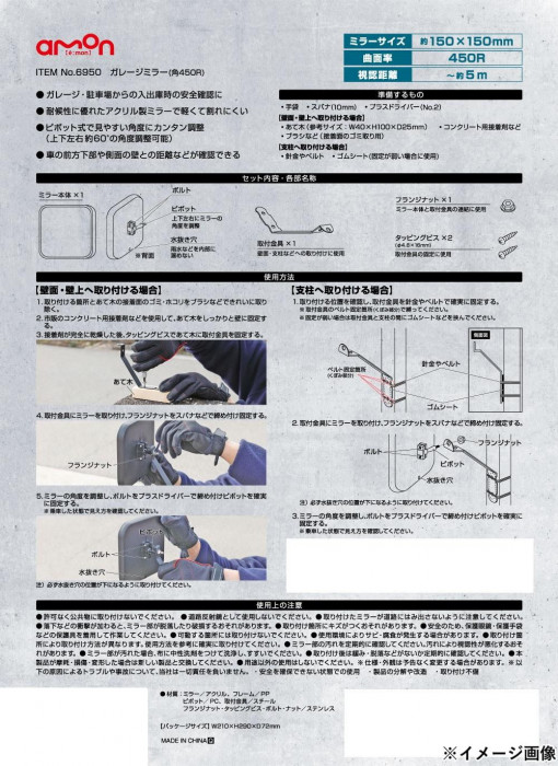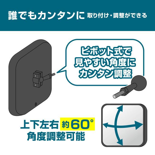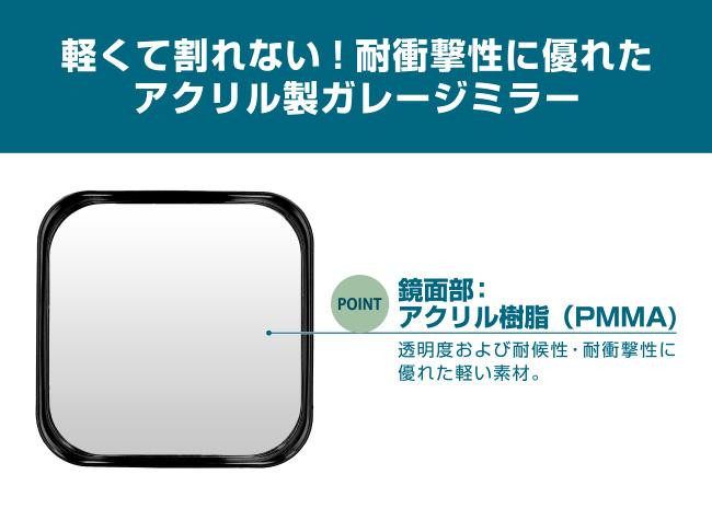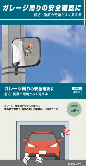 | ガレージ・駐車場からの入出庫時の安全確認に。候性に優れたアクリル製ミラーで軽くて割れにくい。ピボット式で見やすい角度にカンタン調整できます。 |