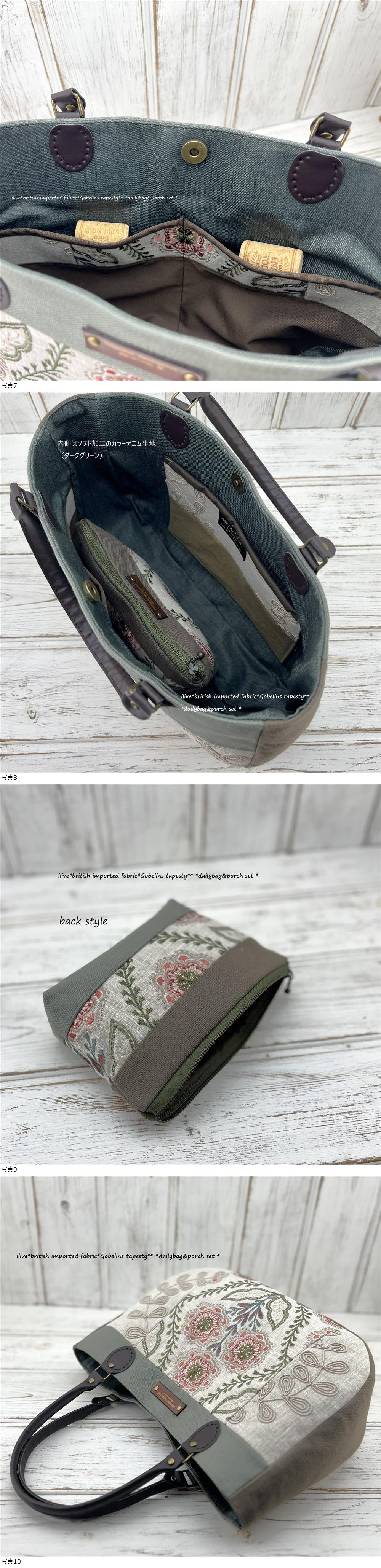 | *商品説明* ~数ある中からお目にとめていただきありがとうございます~ 一つ一つ色合わせや素材にこだわって 丁寧に製作しています 長く気兼ねなく 普段使いに活躍していただけるように 芯地なども工夫して製作しております♪ 至らない部分はあるかもしれませんが ハンドメイドの温かみと 世界に一つのバッグとの ご縁がいただけたら嬉しいです♪ こちらはイギリスインポートの ~CLARKE&CLARK・iliv~ などインポート生地を組み合わせて 製作しています ナチュラルな風合いが魅力的な ロープ刺繍~MALHAM~と モスグリーンとピンクの 上質で繊細な立体感のある花刺繍が とても素敵な~MARCELLA ~と くすみグリーンやモカの インポートキャンバスとで組み合わせて製作した 普段使いに便利なサイズのバッグになります お揃いでお使いいただける ファスナーポーチとのセットになります。 (ブランド生地を使用していますが 個人製作のハンドメイド品です) 本体は軽くてハリのある芯地を 部位に合わせて使い分けて使用していますので 何も入れなくても自立します 内側は丈夫で肌触りの良い ソフト加工のカラーデニム生地 (ダークグリーン)で 大き目の刺繍フリーポケットと 幅いっぱいの2分割ポケットがあります 背面にも18㎝のファスナーポケットがあり 鍵などの紛失防止にも便利にお使いいただけます 正面の本革刻印タグをアクセントに レザー持ち手で落ち着いた雰囲気もありますが 程よいカジュアル感もあり 日常を無理なく格上げしてくれるような 雰囲気のあるバッグかと思います♪ ★サイズ★ ☆バッグ☆ 〇高さ=約23cm 〇重さ=バッグ本体385g 〇バッグ最大幅(平置きで口部分) =約36cm 〇マチ底幅=約10cm 〇持ち手=合皮製(ダークブラウン) 金具部分はすべてアンティークゴールドです ☆ファスナーポーチ☆ 〇高さ=約13cm 〇最大幅=19cm 〇底マチ=5cm ※多少の誤差はご了承下さい。 *発送方法* 定形外郵便(920円) ゆうパックお手軽版 大阪~80サイズ *支払い方法* ヤフー簡単決済 *コメント* 職業用ミシンを使用して一つ一つ心をこめて丁寧に仕上げておりますが ハンドメイド品ですので多少のゆがみ等もあるかと思います。 既製品のような強度や完璧を求める方はご遠慮下さい。 あくまでもハンドメイドとしてご理解のある方のご入札をお待ちしております♪ リネン使用時はリネンの性質上、 ネップやフシが入る場合がございます。 リネン特有の風合いとしてお楽しみください。 気持ちの良い取引ができるよう心がけておりますので どうぞよろしくお願いいたします。 最後までお読みいただきありがとうございました。 |
