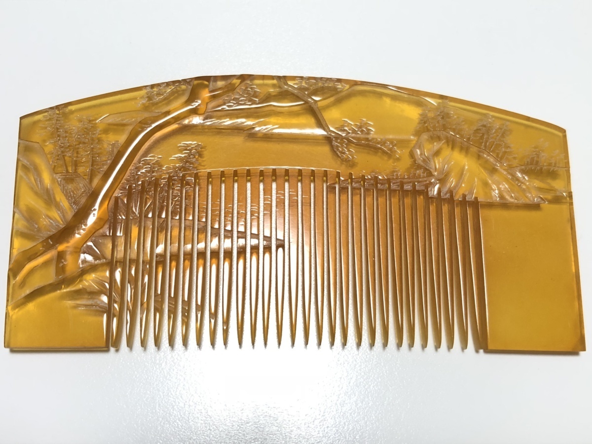 アンティーク、三越の白甲の本鼈甲を使用した、松林山岳細工の櫛と笄です。鼈甲部分に欠けや虫食いは無く、美品です。ケース付属ですが、ケースは破損しています。