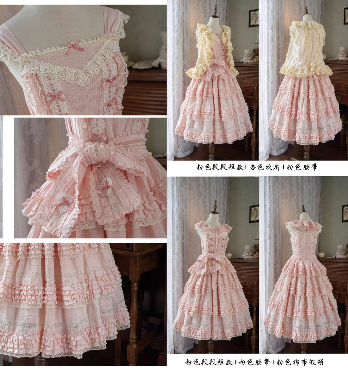 JSK単品です。幅広肩帯のタイプで、Mサイズです。 付属品は、細い帯1本です。値下げはできません。 それ以外におまけで、リボン1個と小さいメッシュのエプロン(ピンで固定)が付きます。 サッシュ、付け襟は別出品していますので、一緒に購入してください。