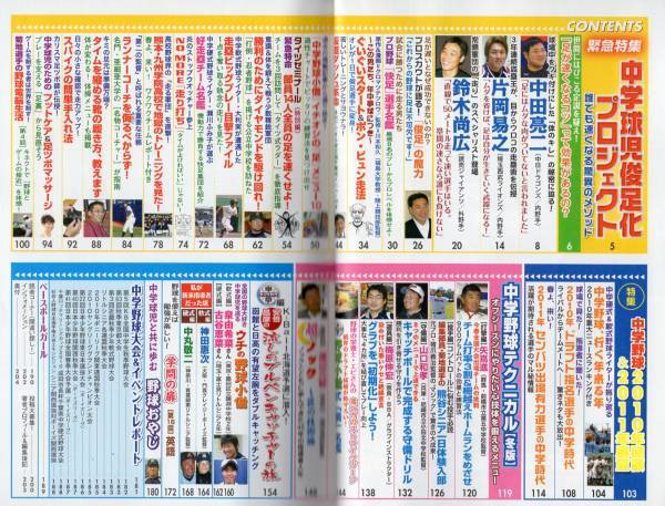 | 100ページぶちぬき緊急特集 中学球児俊足化プジェクト-誰でも速くなる驚異のメソッド/特集 中学野球2010年回顧&2011年展望-中学野球行く年来る年、2010年ドラフト指名選手の中学時代、2011年センバツ出場有力選手の中学時代/スペシャルインタビュー | |||