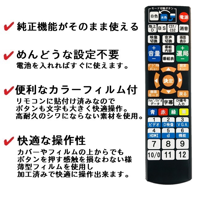 | 【商品名】 VISIO VOシリーズ 代替リモコン 【対応機種】 VO220M-J VO320M-J VO420M-J 上記機種以外については、質問欄よりメーカーと型番をご連絡頂ければ、対応品のご案内をしております。 【商品について】 右側の代替リモコンが出品物になります。左側のリモコンは見本画像です。 タイトル機種のリモコン信号を入力した設定不要ですぐ使える純正品と同等の代替リモコンです。 リモコン左上のモード切換ボタンにて、各機能のボタンをお使いいただけます。 商品に不具合があった場合は代替品交換かご返金にて対応させて頂きます。 【付属品について】 防水リモコンカバーをお付けします。 ボタン機能を印刷した薄型フィルムはリモコンに貼付け済みです。 乾電池は付属しません。別途ご用意下さい。(単4乾電池×2本) 【発送について】送料無料 迅速発送を心掛けております。土日祝日はお時間を頂く場合ございます。 ポスト投函配達となり、日時指定は出来ません。 | ||