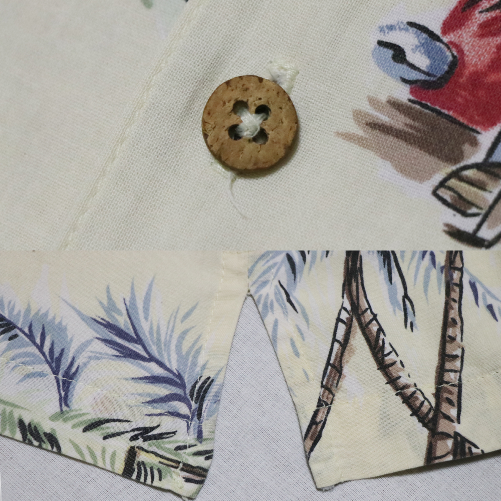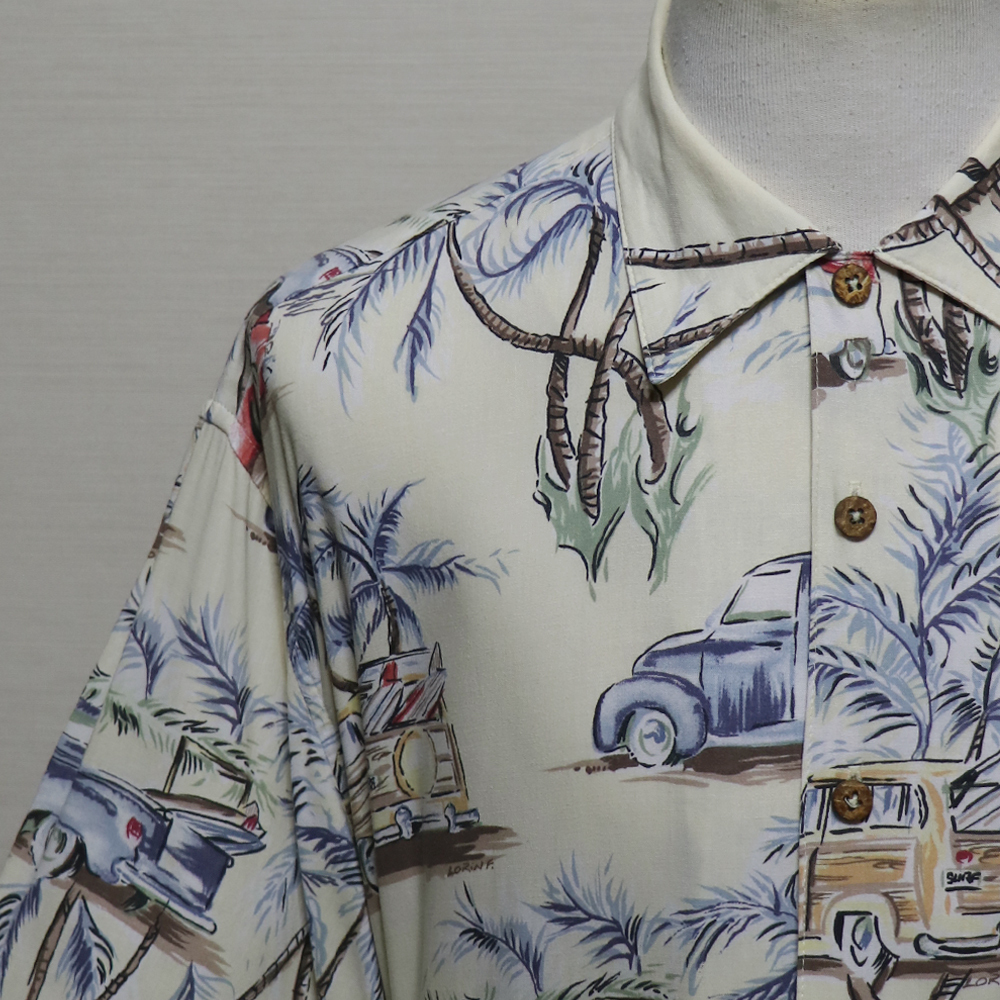 アメリカ購入 美品 90年代 MADE IN USA Blue Water ブルーウォーター コットンレーヨン サーフボード&サーフカー プリント 半袖アロハシャツ L サイズです。