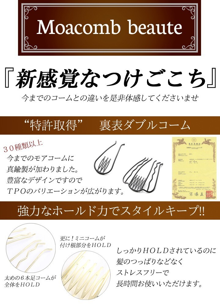 | 商品説明 | お客様の声から実現!『ショートサイズ』 足が少しだけ出てしまったり、頭の形に添わないというご意見をいただき、 従来品より1cm足の短いものも開発致しました。 毛量少なめの方や頭の小さい方など従来品ではご満足いかなかった方に 是非お試しいただきたいです(^O^)/ ◆日本特許取得済◆ 夜会巻きコームに新革命!!業界初の表裏ダブルコームでキープ力抜群!! 太めの長い6本足コームが全体をHOLDし、短いコームが付け根部分をHOLD コームをつけたときの嫌なツッパリ感などないため、長時間付けて居られる優れものです。 シンプルデザインですので、どんなシーンでもマッチします。 ストーンの周りの細工がアンティークぽくなっていますので、控えめを好む方にはぴったりです。 ジュエリーケース希望の方は別途300円でお付けすることができます。 ご希望の方は、購入手続きの下にある【こちらの商品をまとめて購入】から合わせて購入くださいませ。 |