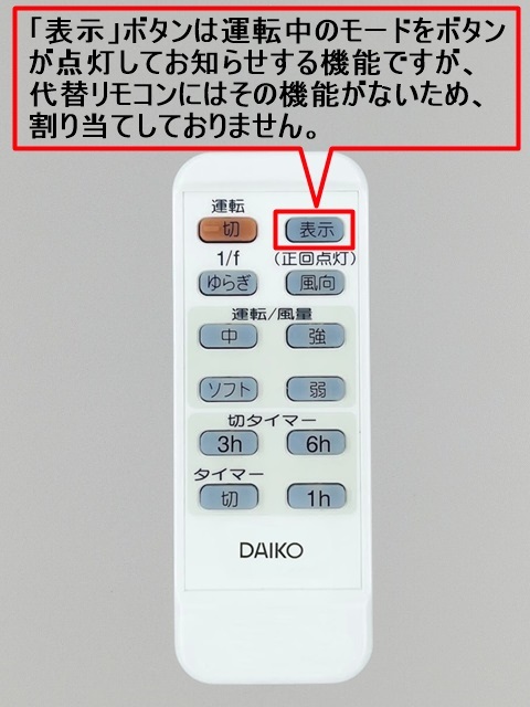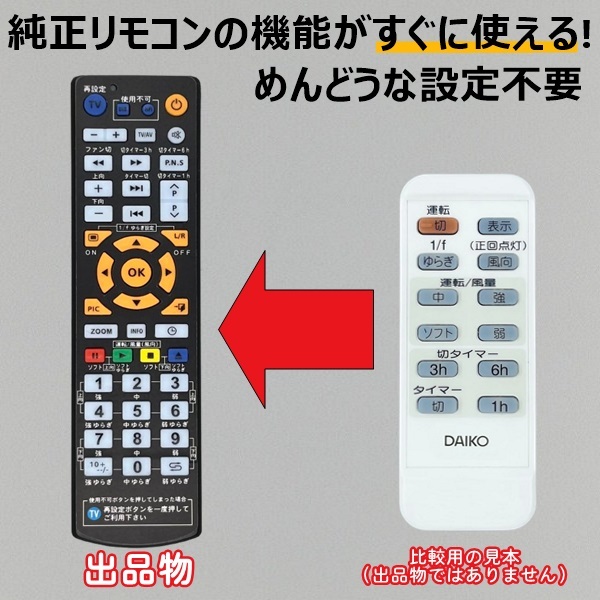 | 【商品名】 DAIKO T3481191 代替リモコン 【対応機種】 DP-34812 DP-34811用 比較画像の右側の純正リモコンが付属する機種に使用出来ます。 上記機種以外については、質問欄よりメーカーと型番をご連絡頂ければ、対応品のご案内をしております。 【商品について】 左側の代替リモコンが出品物になります。右側のリモコンは見本画像です。 タイトル機種のリモコン信号を入力した、設定不要で使える純正品と同等の代替リモコンです。 「表示」ボタンは運転中のモードをボタンが点灯してお知らせする機能ですが、 代替リモコンにはその機能がない為、割り当てしておりません。 乾電池は付属しません。別途ご用意下さい。(単4乾電池×2本) 【商品サイズ】 縦18.5cm×横5cm×高さ2.35cm 【発送について】送料無料 迅速発送を心掛けております。土日祝日はお時間を頂く場合ございます。 ポスト投函配達となり、日時指定は出来ません。 | ||