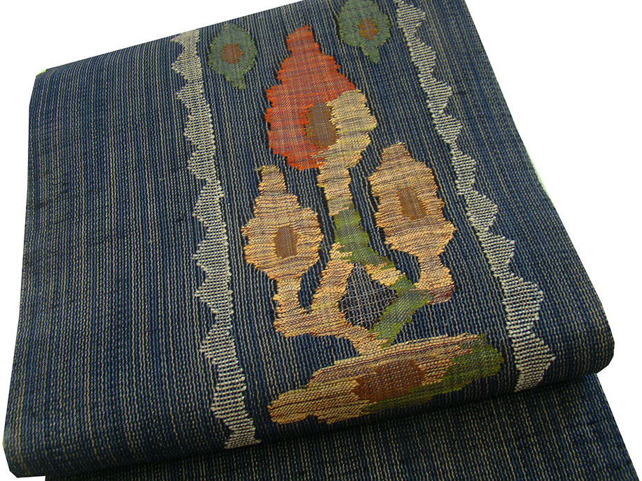 紺地に灰色、金茶、緑、臙脂等の織柄。