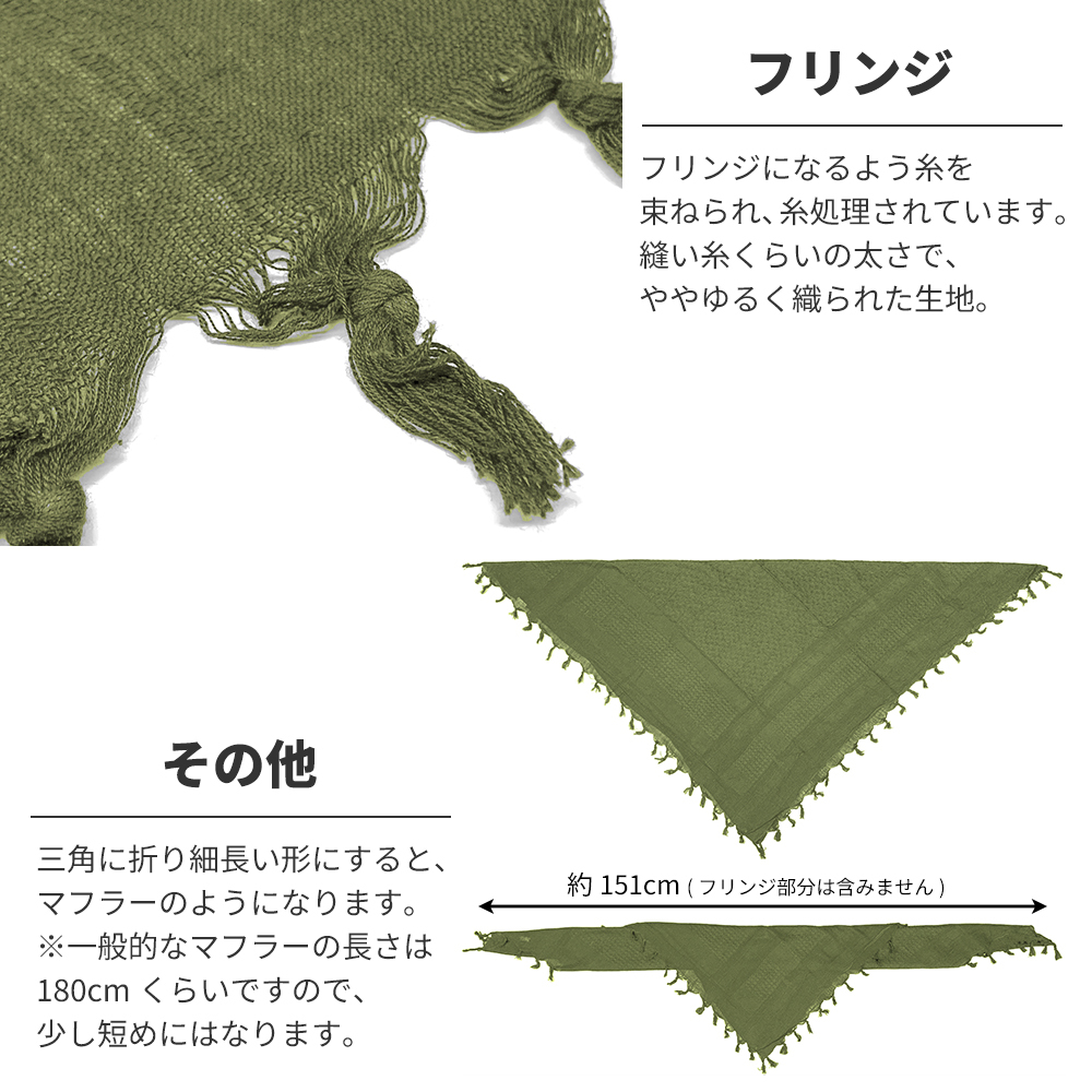 ![]() USミリタリーブランドの老舗ROTHCO社のシュマグ(別名:アフガンストール)です。緩く織られた薄手の生地でコットン100%。端の方はフリンジで糸処理されアクセントになってます。大判の生地ですので工夫によっては、マフラーから腰巻など多岐にわたります。全体的な織りの緩さや糸処理など非常に荒い作りですが、逆に洗練・計算さた物とは違う点が良いかもしれません。 本来の使用:砂漠地帯での砂塵や日光・熱風などを防ぐ為の物になり、緊急時の包帯・バッグ(風呂敷感覚)・タオルなど大判ならではの使い方となります。 ※非常に簡易に作られてますので、生地擦れ・シミ・ヨレ・シワ・縫製の悪さなどはあります。 MADE IN INDIA 【ネコポスご利用の際の注意点】 ・ご入金確認後の発送。(代金引換は不可) ・代金引換をご希望の場合は宅急便送料+代引手数料になります。 ・ご自宅のポスト投函配送ですので日時指定不可。 ・荷物の紛失・破損に対する引受限度額は3,000円となります。(ヤマト運輸による補償) ・万が一の不着破損等でも、ヤマト運輸との連絡のみで、当店は一切の補償クレームはお受けできません。 ・商品発送後にお荷物番号をお知らせしますので、クロネコヤマトにてお荷物追跡可能です。 ■Brand: ROTHCO ■商 品 名: SHEMAGH TACTICAL DESERT SCARF ■カラー: ソリッド オリーブ ■素材: コットン100% ■サイズ表(cm): 《本体》幅約107cm×縦約107cm ※フリンジ部分は含みません。 (上記の数値はあくまで目安です。) ■仕入元: ROTHCO本社 ■状態: 新品未使用 |