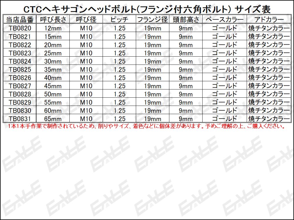 M10 CTCヘキサゴンヘッドボルト (フランジ付六角ボルト) 丁寧に削り出されたボルトに金メッキを施した美しい仕上がりで、特にヘッド部分は肉抜きと穴あけ加工を施し、特殊な方法で焼チタンカラーを再現した、普通のボルトにはないオリジナルな仕上がりです。 ステンレスを使用しているので強度も十分にあり、フレーム周辺やエンジン周り、サスペンションなどM10が使用されている場所なら色々な箇所に使用して頂けるよう各種サイズを用意しました。 ※出品は右記およびタイトルの“呼び長さ”“カラー”です。 ご落札後の変更はお受けできませんので必ずご確認下さい。 他の呼び長さは⇒ こちら 同デザインで違う呼び径・呼び長さ・カラーは⇒ こちら その他の六角ボルト・キャップボルトは⇒ こちら その他のボタンボルトは⇒ こちら その他のネジ(ビス・スクリュー)は⇒ こちら その他のナット・ワッシャーは⇒ こちら |