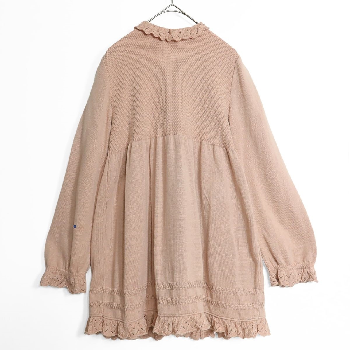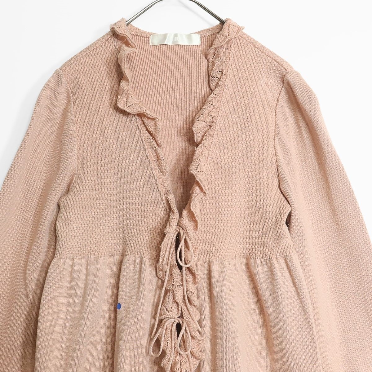 | 商品説明 | 【実寸約】裄丈76後ろ幅38着丈70(cm) 【サイズ表記】 なし。実寸をご参照くださいませ。 【素材】 綿50アクリル50% 【状態】普通の使用感のあるお品物 薄シミ数か所あり 【デザイン】ピンク系 ギャザーたっぷりの長袖ニットカーディガンです。 襟からフロント、裾にかけてふんわりフリル付き フロントはボタンレスで、リボンを3か所結んで留めるデザイン。 |