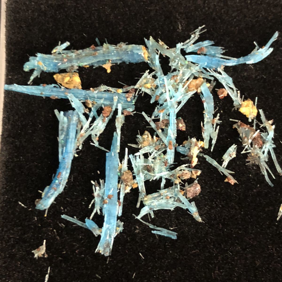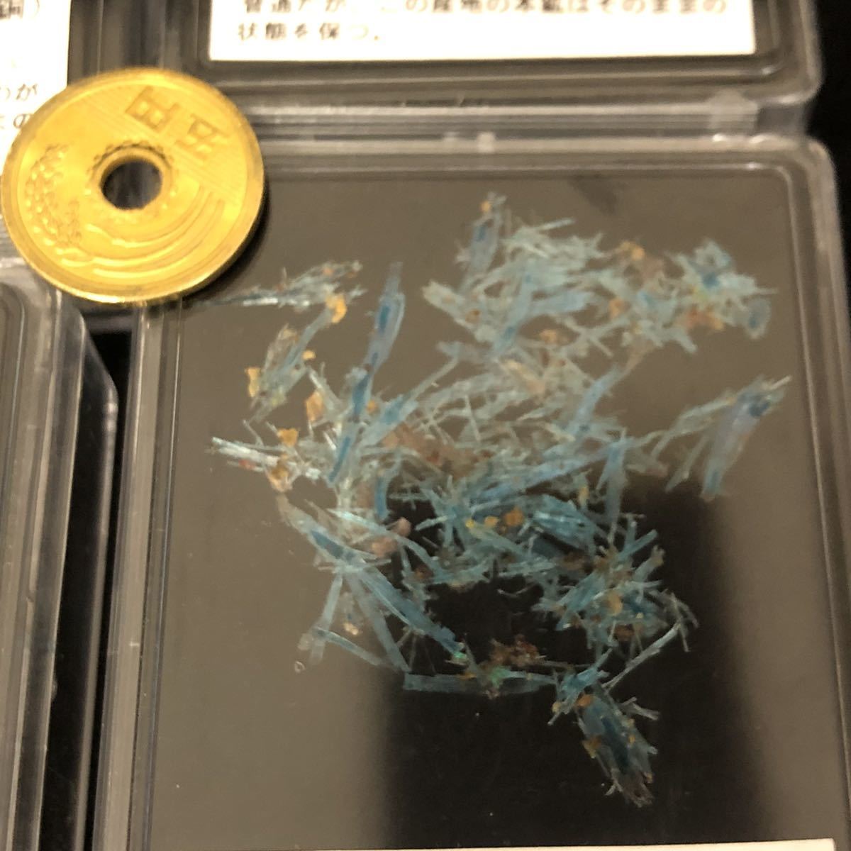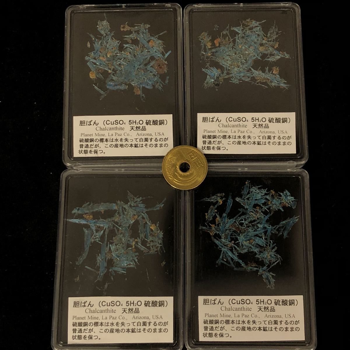 ★通常配送全国無料1ケースの値段です。目分量でケースに入れています。だいたいの量は写真を参考にしてください。 若干の差はご容赦ください。硫酸銅の水和物で、簡単に水に溶けてしまいます。したがって水洗いはNG。 大気中の水分にも気を付けたいので、密閉できる容器の中に入れておくと良いが、乾燥させすぎもいけません。 また、毒性があるので保存の際には注意が必要です。ギリシャ語で銅を意味するKhalkosカルコスと、花を意味するanthosアンソスを合わせてChalcanthiteカルカンサイトと名付けられました。鮮やかな青色が美しい鉱物です。●産地:Planet Mine, La Paz Co., Arizona, USA 硫酸銅の標本は水を失って白濁するのが普通ですが、この産地の本鉱はそのままの状態を保っています。 在庫の中から1ケースをランダムにお送りします。