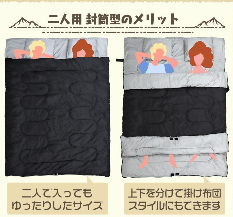 | どんなスタイルにも合わせやすいカラーの寝袋です。 ダブルサイズなので、親子やカップルでの使用に便利! 分割して1人用としても使用可能です。 うれしい枕付き♪ 収納に便利な圧縮ケース付! オールシーズン対応! 【快適温度】 25~8℃(使用限界温度:-4℃) 【サイズ(約)】 使用時(約):縦217cm×横146cm 重さ(約):2.8kg 【商品詳細】 内容:本体×1・収納袋×1 カラー:カーキ |