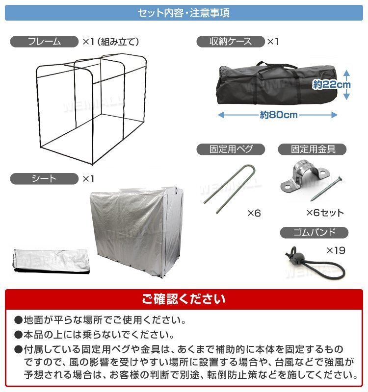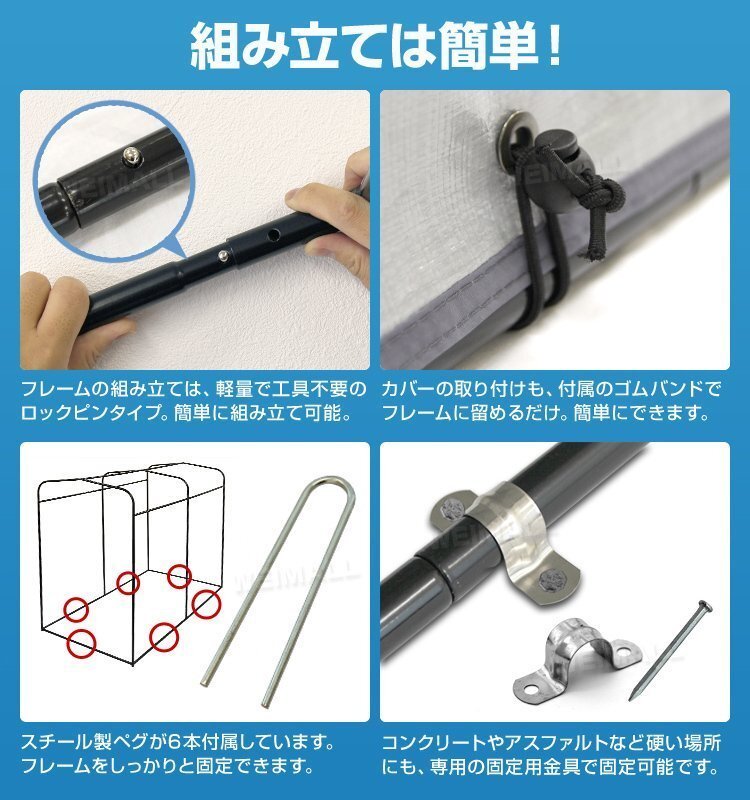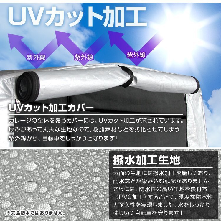 | 自転車1~2台を収納可能! UVカット加工、撥水加工生地を採用! 大切な自転車やバイク、お荷物をホコリや雨から守ります。 目隠しになるので盗難防止効果もあり! また自転車だけでなく、農業用品、園芸資材の収納庫としてもご利用いただけます。 【商品仕様】 本体サイズ(約):幅100×奥行180×高さ160cm 重量(約):10kg 材質:スチール、ポリエステル 他 【注意事項】 ・気温の寒暖差によりサイクルハウス内が結露することがあります。 ・台風、竜巻はもちろんのこと、強風時は直ちに使用を中止し、テント生地を外してください。 風により転倒したり、風で飛ばされたりする危険があります。製品の破損や周りの建物や壁、置物、車などを傷つける恐れがあります。 ・風の影響は設置場所や気候によって大きく異なりますので、固定方法はお客様の責任で行ってください。 ・火の近くで使用しないでください。 ・地面が平らな場所でご使用ください。凸凹がある場合や斜めの場所で使用しますと転倒したり、風で飛ばされたりする危険があります。 【もちろん新品未使用品です】 ▼検索キーワード |