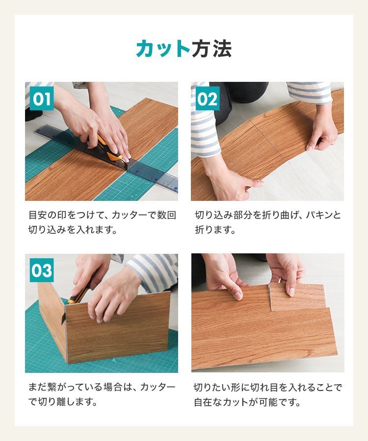 | 自分で出来る、簡単リノベーション! お部屋の雰囲気ガラリと変わるフロアタイルです。 床を変えることで、今までと全く違ったお部屋に大変身♪ 裏面は粘着性があるので、接着剤なしで施工可能。 シートをはがして貼るだけ!超カンタンです♪ ハサミ、カッターでカットできて扱いやすく、女性でも部屋の隅々まで貼ることができます。 ご自宅のお部屋をオシャレにしたいけど、今の床の色味が気に入らない…などのお悩みのお客様にぴったり! 北欧風や西海岸風など、どんなインテリアのテイストにも合わせやすく、おしゃれなフロアが誰でも気軽に楽しめます。 ■商品コード:FCD001GO ■商品仕様 カラー:グレイッシュオーク 72枚セット サイズ(約):幅910mm、奥行150mm、厚み2mm 重量(約):430g ※1枚あたり 素材:PVC ■注意事項 ・畳や絨毯のようにやわらかい場所や凹凸のある場所ではご使用できません。必ず硬くて平らな床の上でご使用ください。 ・サイズには若干の誤差がありますので、タイル同士の隙間で調整しながら敷き詰めてください。 ・床暖房のお部屋にはご使用できません。 ・気温や湿度の変化でタイルが伸縮する場合があります。 ぴったり敷き詰めすぎると伸びた際に突き合ってタイルが浮き上がってしまいますので少し隙間を開け敷いてください。 ・気温が低い場合は、接着力が弱くなりますので部屋を温めるかドライヤー等で商品を暖めてから作業してください。 ・この商品はケース販売のみです。 申し訳ございませんが、枚売りが出来ません。 ・生産ロットが違う場合、柄・色味が若干変わってくる場合がございます。 ・商品を使用して発生した事故・トラブル・破損等につきましては一切の責任を負いかねます。 ・商品は、モニターによって色合いが異なって見える場合があります。 ・仕様・デザインは改良のため予告なく変更することがあります。 ■保障期間 7日間 ※商品到着後7日以内の初期不良・破損のみご対応させていただきます。 【新品未使用品です】 |