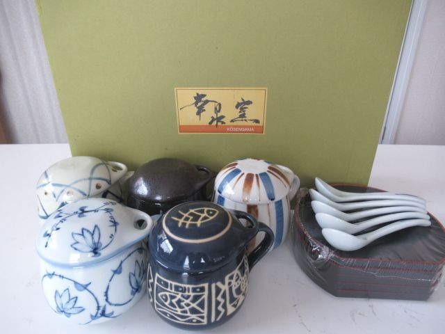 | *** 幸泉窯 茶碗蒸し器 コーヒーカップ ティーカップ 5客 スプーン 受け皿 セット 新品 *** |