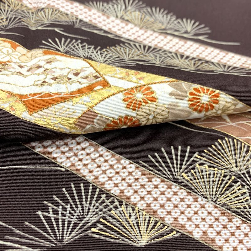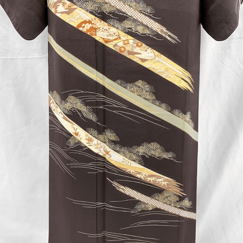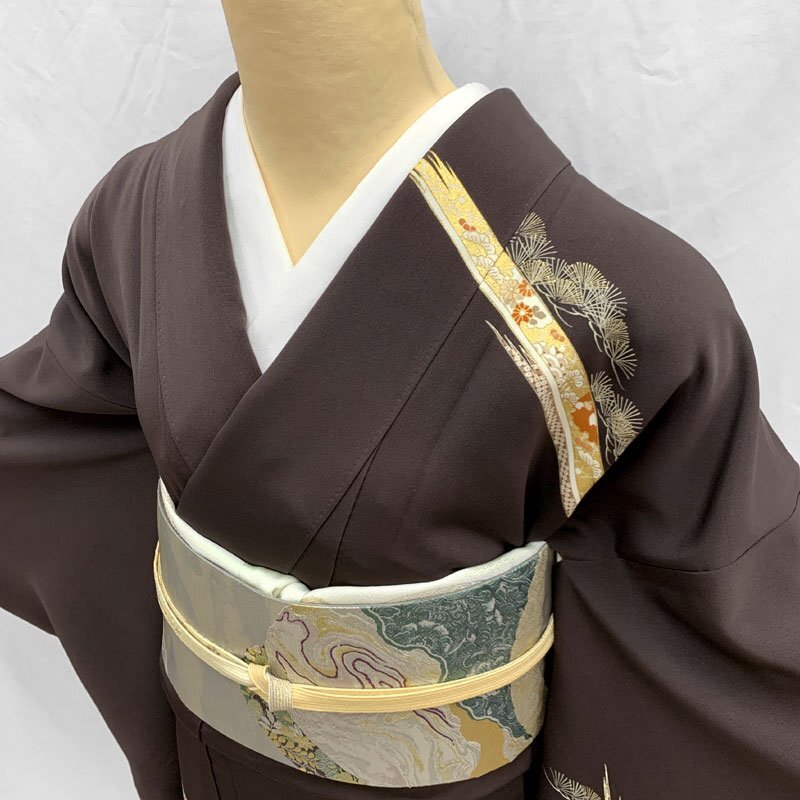 | 〇訪問着 一つ紋 金駒刺繍 金彩 焦げ茶 松竹梅 菊 扇〇美品 (No.kd) 筆でサッと描いた風のような文様に扇や松竹梅、橘、菊などの文様が染め出された訪問着です。金駒刺繍や金彩が施され、光の加減で輝きが増します。刺繍の一つ紋で、紋の種類は「下がり藤」です。 (画像の帯507my93や小物は参考商品で、本品には含まれません) 衿裏のスナップボタンに錆がございますが、問題なくお使いいただけます。白い部分にところどころアクがございますが、近くでよく見ないとわからない程度です。 【表地素材】正絹 【色】焦げ茶 *モニターによって色味は実際と異なる場合がございます。 【サイズ】裄:67.5cm、丈(肩から):168cm、袖幅:34cm、袖丈:49cm、前幅:25cm、後幅:30cm、裄の縫込み 身頃側:3.5cm、お袖側:2.5cm、内揚げ幅:2cm *素人採寸のため、多少の誤差はご容赦ください。 上質な逸品ですので、いかがでしょうか?よいお品物でお勧めです^^ | |