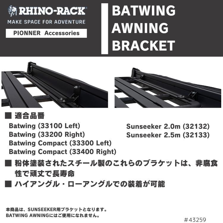 | 詳細 | Rhino-Rack バットウィングまたはサンシーカー オーニングをパイオニア トレイまたは プラットフォームに直接取り付けるのは、特別に設計されたブラケット キットを使用するほど簡単です。 キットに含まれる 2 つのブラケットを Rhino-Rack Pioneer トレイまたは Pioneer プラットフォームに取り付けるだけで、 多機能アセットを作成できます。これら 2 つの Rhino-Rack ブラケットは、 オーニングをさまざまなサイズのトレイまたはプラットフォームに適合させます。 これらのブラケットは粉体塗装されたスチールで作られており、非腐食性で丈夫なので長寿命で、 あなたの車をキャンプ/アウトドアのアクセサリーに変えます。 |