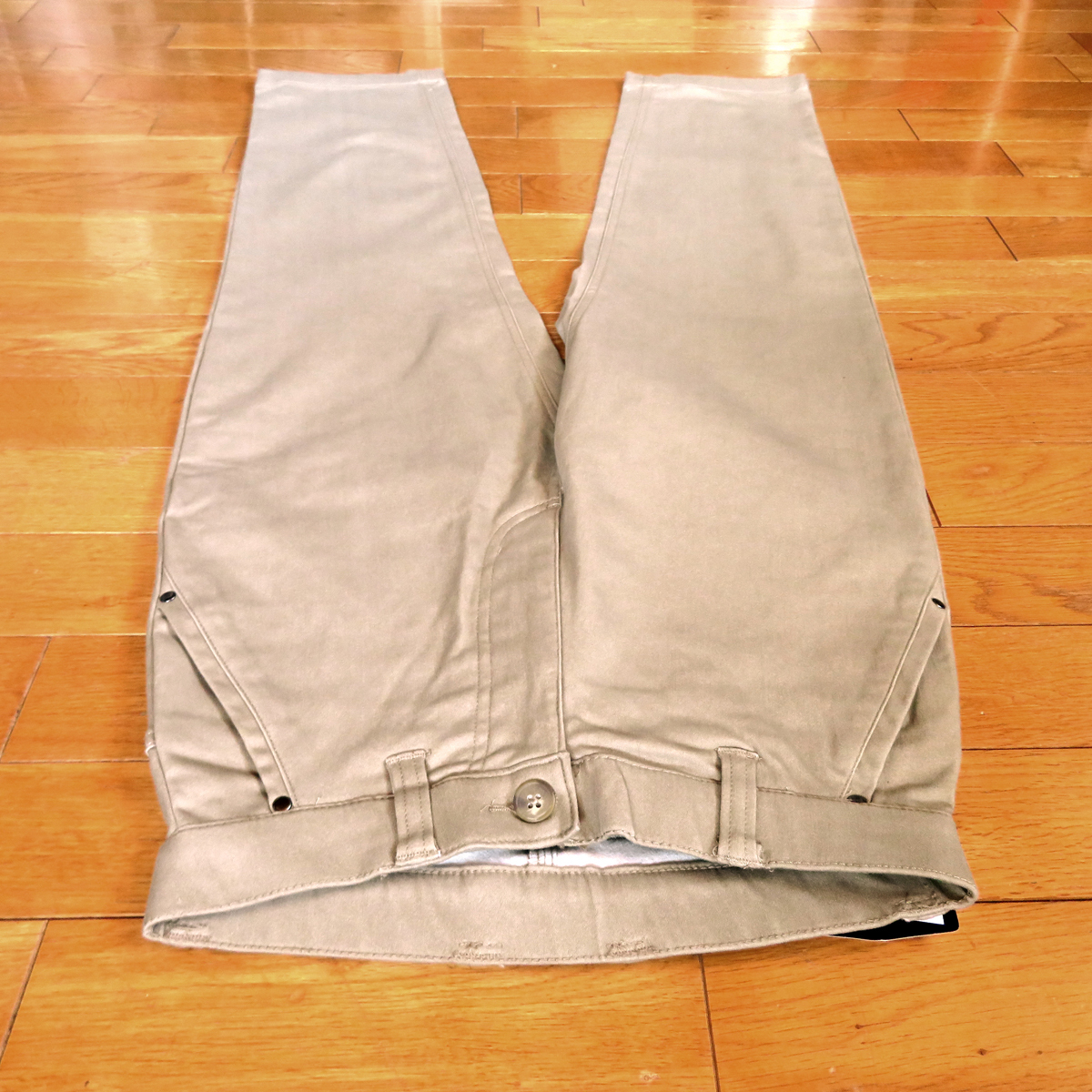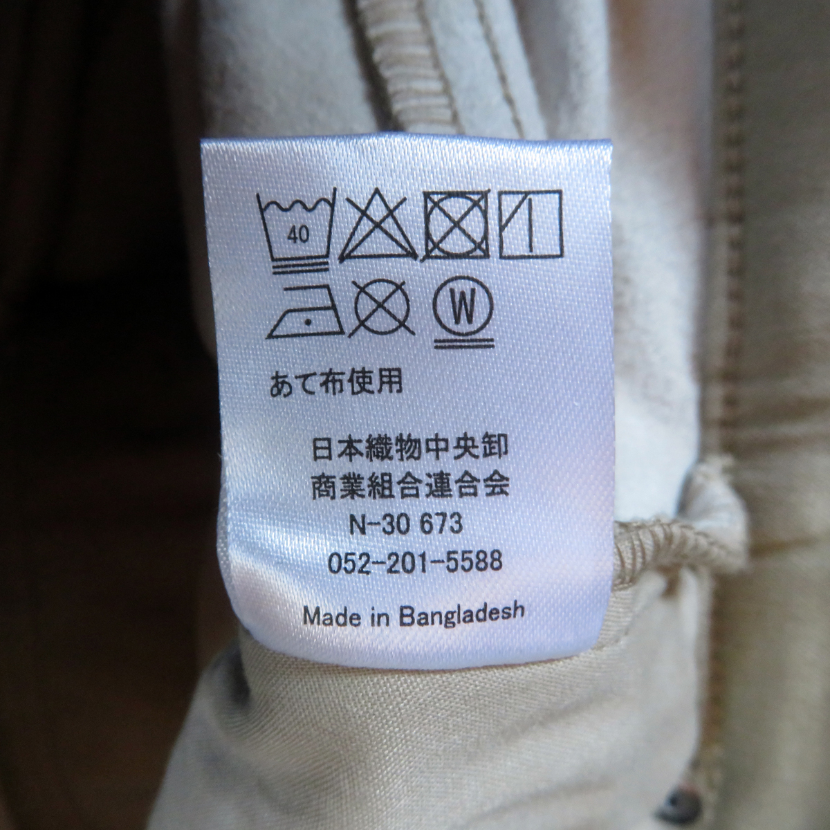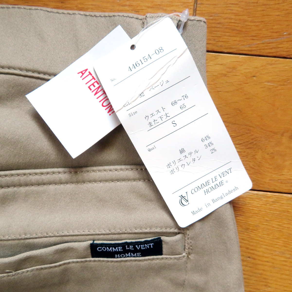 COMME LE VENT HOMMEのストレッチがうれしい快適らくらくチノパンです。 ストレッチがかなり効いていて、すごく履きやすくなっているチノパンツです。 生地も柔らかめで肌触りもとっても良い感じなっています。 シルエットな普遍的な、チノパンシルエットですごく使いやすくなっています。 お色は、ベージュ色です。 すごく便利なアイテムです。いかがでしょうか^^ 【コンディション】 タグ付きのまま、未使用で保存してしまっていたものです。 経年経過で、多少のダメージや薄汚れ等あるかもしれませんが、見たところ 着用に支障があるような大きなダメージ、汚れなどは有りません。 きれいだと思います。十分着用していただけます。 ------------------------------------------- 【表記】サイズ S 【実寸】 平置き ウエスト 32cm×2(64cm)(平置き後ろ直線測定) 股上 27cm 股下 62cm 裾幅 18.5cm わたり幅 25cm(付け根から10cm下を水平に計測) 前後程度になります。※平置き、素人採寸になりますので、多少の誤差はお許し下さい。 ------------------------------------------- 【材質】 綿64% ポリエステル 34% ポリウレタン2% 【色】 ベージュ 【未使用タグ付き品】 ------------------------------------------- ◆ 他にもいろいろデニムなど出品していますので、よかったら見ていってください。 ◆ もちろん同梱もできますので、お気軽にご質問ください。 ◆ 気持ちの良いお取引を目指していますので、ご質問は事前にお気軽にどうぞ。 終了直前だとお答えできない場合があります。どうぞよろしくお願い致します。 | ||||