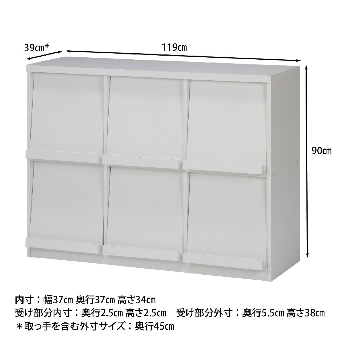 | サイズ | 全体:幅119×奥行39(フラップ扉45)×高さ90cm 収納1マスあたりの内寸サイズ ・扉を取り付けた場合(有効内寸サイズ)幅37×奥行35×高さ34.5cm ・扉を取り付けない場合(最大内寸サイズ)幅37×奥行38×高さ37cm |