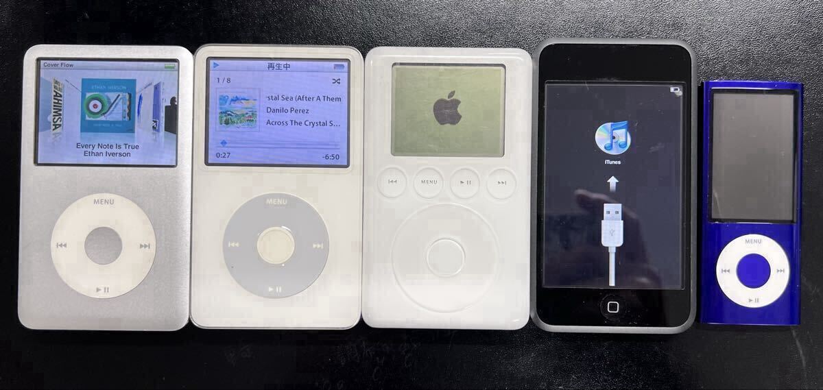 歴代iPodです。160GB、60GBのtouch 16GBの3台は充電後通常に起動、音楽再生もステレオイヤホンにて確認できました。充電池の状態は160GBは良好な様ですが、他の再生可能なものは長時間の再生については不明です。ミニは通電はするものの充電ケーブルを外すと電源が落ちます。20GBはAppleマークの表示まででストップしてます。| 出价者 | 信用 | 价格 | 时间 |