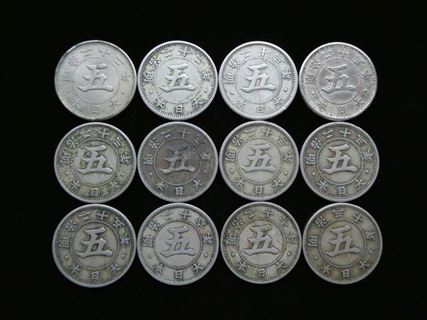 | ★商品★ ・菊5銭白銅貨 ★商品詳細★ ・明治22年 (1889年):2枚 ・明治23年 (1890年):6枚 ・明治25年 (1892年):1枚 ・明治26年 (1893年):1枚 ・明治27年 (1894年):1枚 ・明治30年 (1897年):1枚 ※計12枚の出品となります。 ★寸法★ ・直径 (約)20.5mm ・厚さ (約)1.8mm ★重量★ ・(約)4.5〜4.7g ★品位★ ・銅750/ニッケル250 ※日本貨幣カタログ参照 ★状態★ ・年代物になりますので経年劣化が見られます。 ・傷、摩耗、汚れ、変色などが見られます。 ※備考※ 商品状態に関しては、あくまでも当方の見立てとなります。 程度には個人差がございますので、商品画像を良くご覧になられた上でのご入札お待ちしております。 |