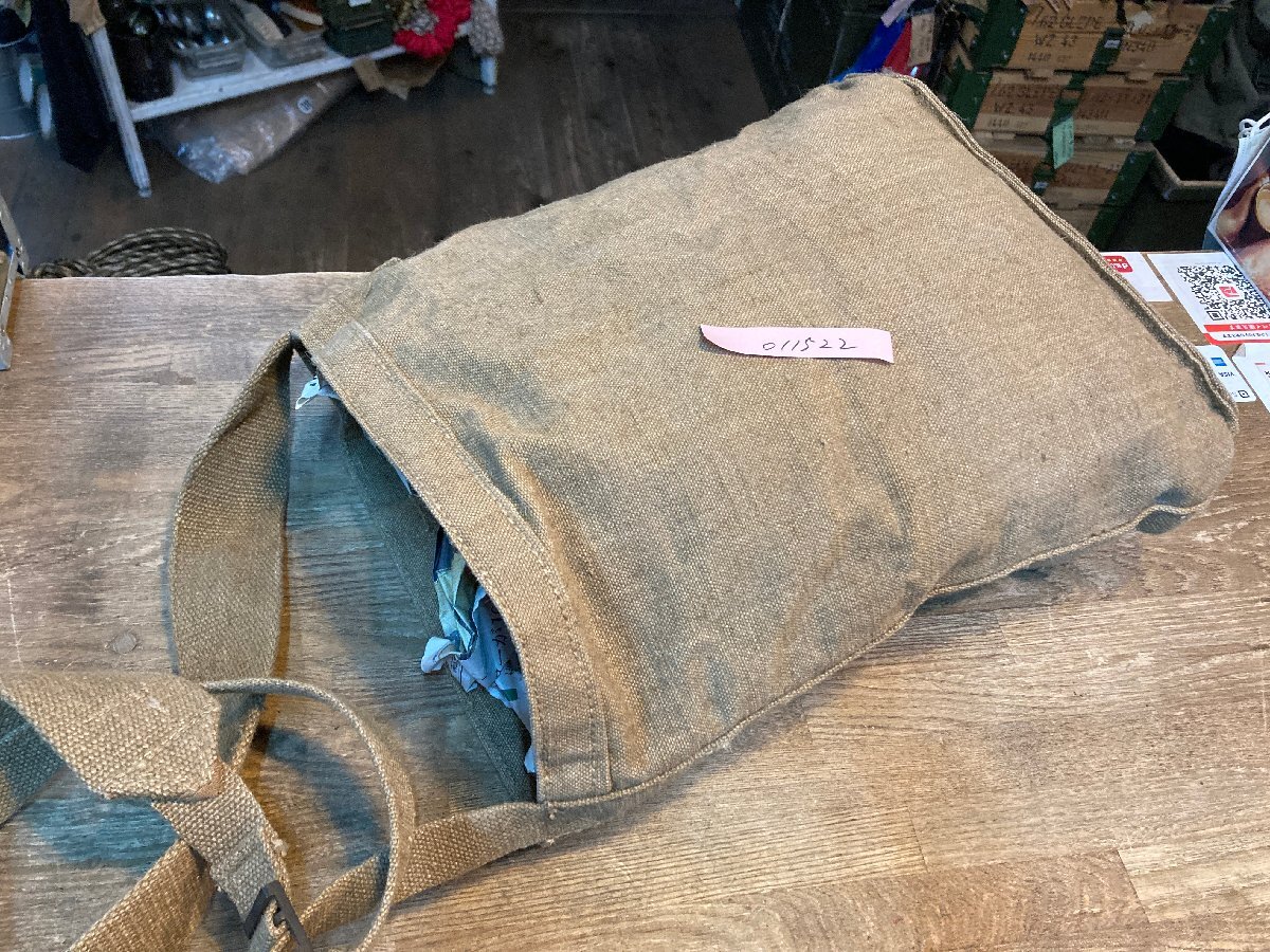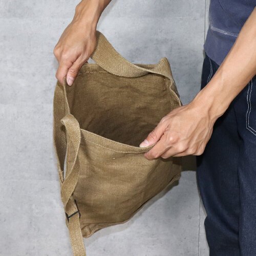 丈夫なリネンキャンバス地が使用されています。調節可能なショルダーストラップが付いています。