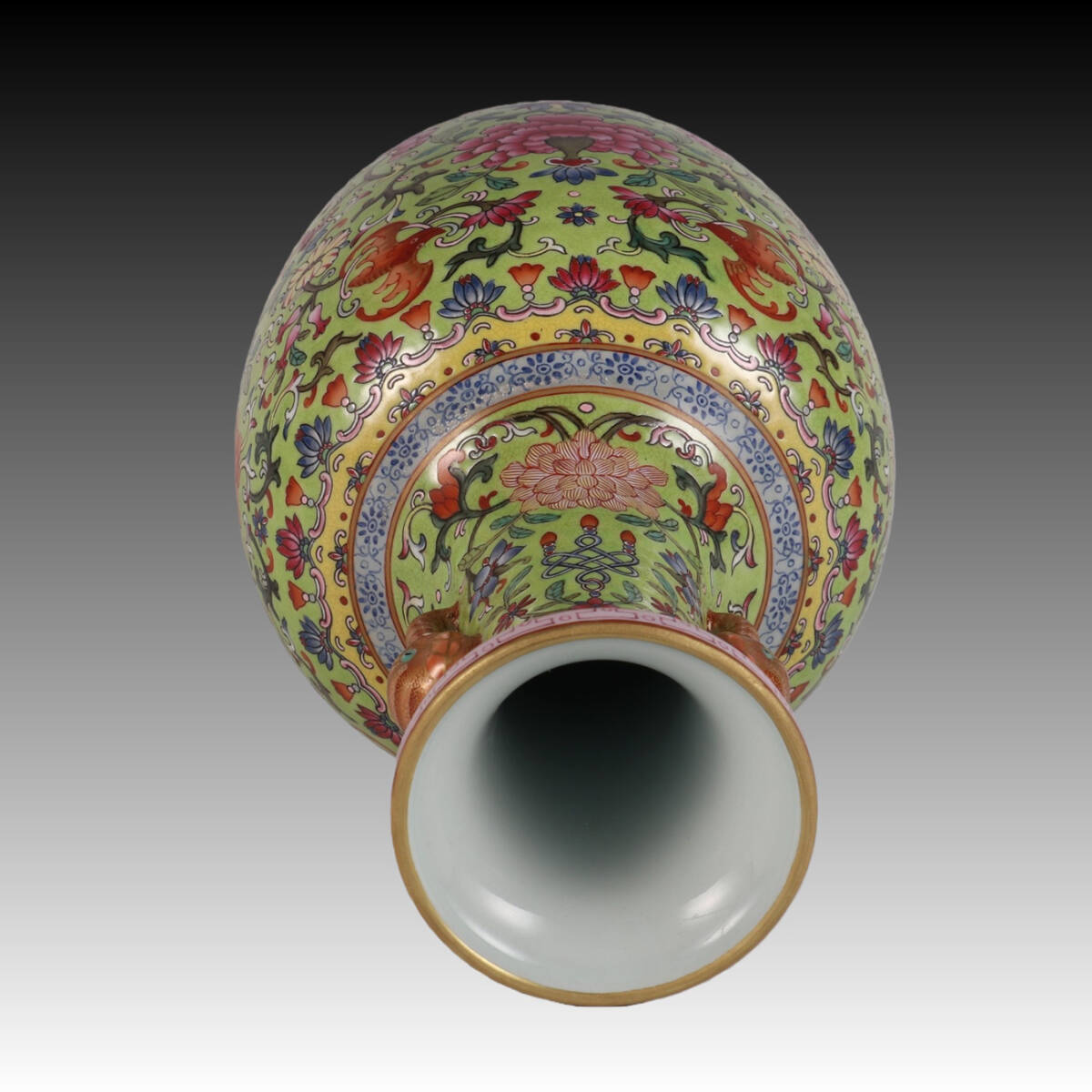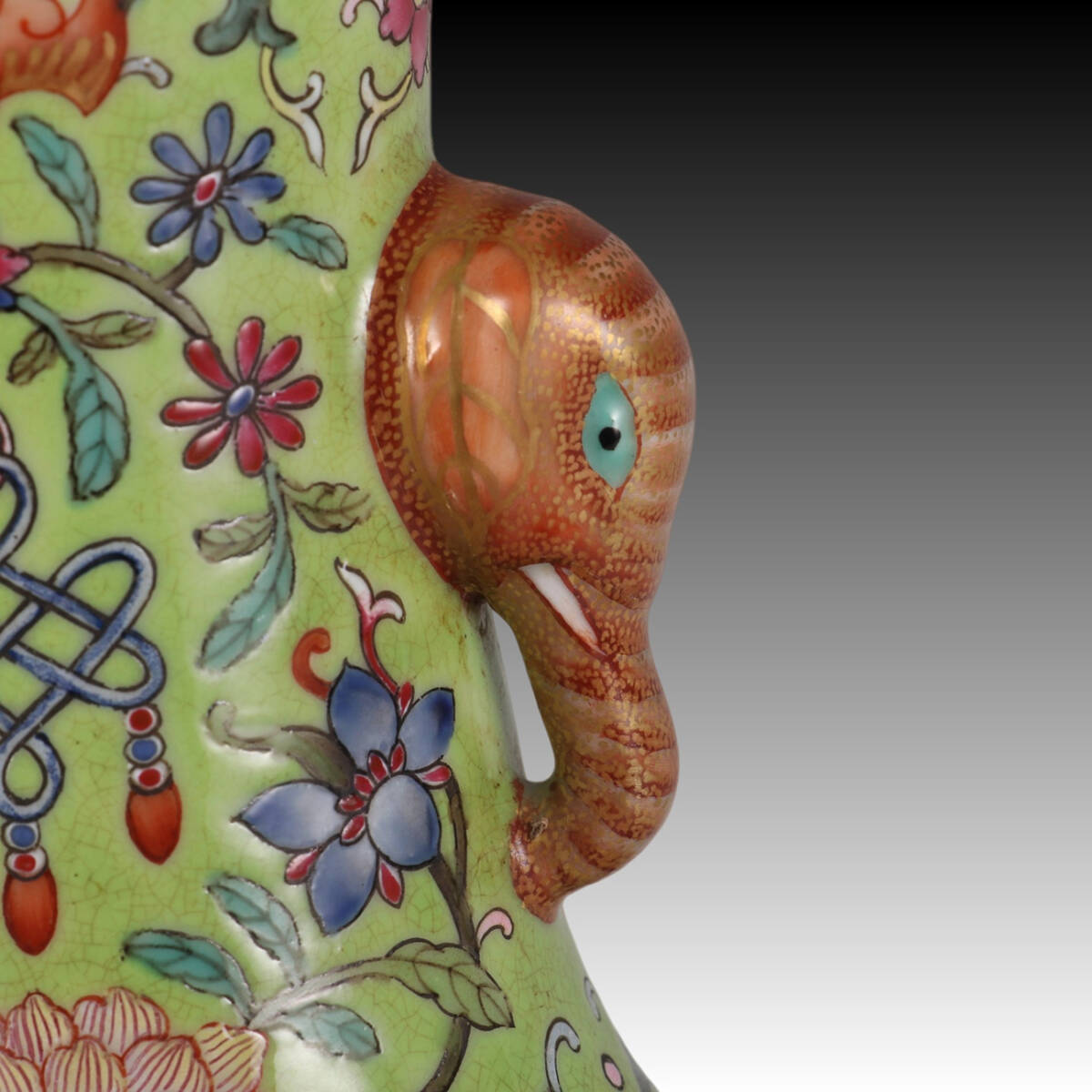 ◆御泓軒◆『清朝時代 陶磁器 緑地粉彩福運連連紋象耳瓶 清乾隆年製款・箱付』極細工・古賞物・中国古玩・中国古美術