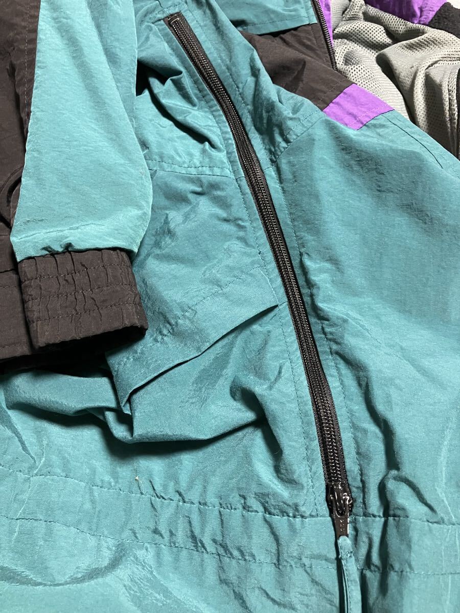 グリーン系で襟元はパープルでブラックの切り返しがあります。