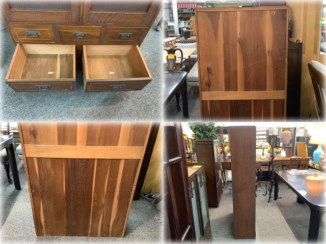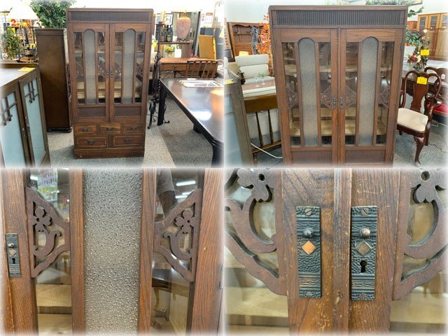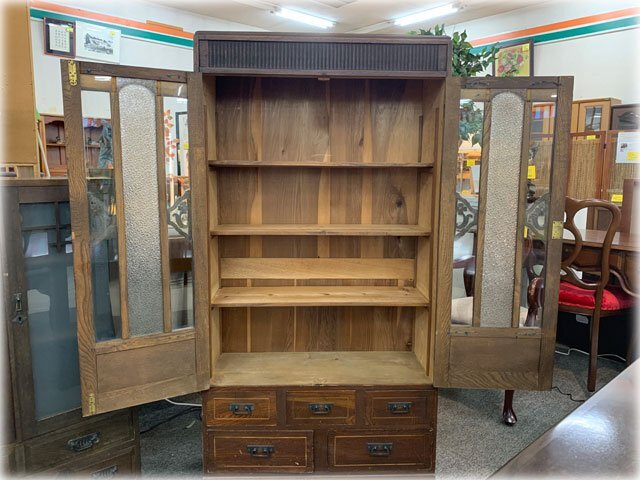 飾りガラス木製キャビネット を出品いたします。 ■特徴■ 大正後期~昭和初期頃のものと思われる 木製のキャビネットです。 上段は観音開き、 下段は引出しといった構成です。 観音開きの扉には いわゆる「ダイヤガラス」といわれる 模様の入った型板ガラスが 飾りに使用されています。 扉の取っ手が欠損しているなど、 経年の使用感などは見られますが、 味としてお愉しみください。 アンティークの易損品となりますので、 弊社まで直接引取りに頂ける方の入札 をお願いします。 写真に写っている周りのものは付属しません。 格安出品いたしますのでこの機会をお見逃しなく! |