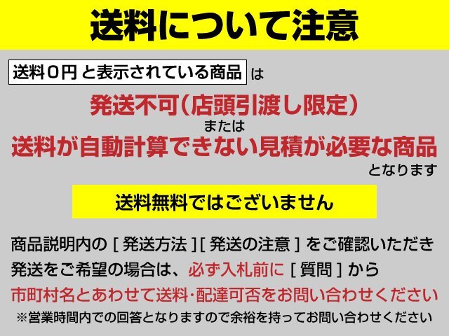 | 【お支払い金額】 落札価格 + 消費税 + 送料※ となります。 ※一部地域(沖縄県・離島)は別途追加料金が発生する場合がございます。 取りに来て頂く場合は送料はかかりません。 積み込みのお手伝いも可能です。 経費節減にも繋がりますので積極的にご検討をお願い致します。 【お支払い方法】 ・ストア決済(PayPay残高払い・PayPayクレジット・クレジットカード) ・銀行振込(八十二銀行・ゆうちょ銀行) ※落札日より7日以内に店頭引渡しの場合に限り、店頭での現金払いも対応します。 ※振込手数料はお客様負担でお願い致します。 発送方法変更・オプション追加・同梱発送等で請求金額に変更が発生する場合、差額は銀行振込での対応となります。 お支払いについては、原則 落札日より7日以内の入金をお願いいたします。 ご連絡無く落札日より10日以上経っても商品代金をお支払いいただけない場合、落札者様都合にて削除させて頂く場合がございます。 【送料】 ・送料につきましては現在価格付近に表示されている送料をご確認ください。 ・「送料 0円」と表示されている場合は、発送不可もしくは都度見積が必要な商品となります。 詳細は出品ページの[発送の注意]を必ずご確認ください。 送料が発生する場合は別途銀行振込での対応となります。 ・西濃運輸は営業所留めの料金が表示されています。指定住所宛配達の場合は追加料金が発生いたします。 ・送料のお見積もりをご希望の方は、下記「●お問い合わせ」の項目をご確認ください。 【ご来店でのお引渡し】 少人数スタッフで運営しておりますので、原則予約制をさせて頂いております。 落札後に引渡し場所をご案内いたしますので、ご来店希望日時のご連絡をお願い致します。 倉庫保管品の場合はスタッフ配置の都合で、すぐでは対応出来ないこともございますので、 日数に余裕を持って、いくつかの候補日時をご連絡頂くとスムーズです。 ・ご来店時には商品保護用のあて布、固定用のロープなどのご持参をお願い致します。 ・分解・梱包作業についてはお手伝いできませんので、お客様にてお願い致します。 ・商品サイズをご確認のうえ、確実に積込める荷台の車輌をご用意下さい。 積込中・積込後に関する責任は負いかねますので、固定等はお客様責任でお願い致します。 ・重量物に関しては積込みのお手伝いをさせて頂きます。 平ボディ以外のトラック(乗用車・バン・箱型トラック)で開口部が狭いなど、車両や商品を傷つける恐れのある場合はお手伝いできません。 |